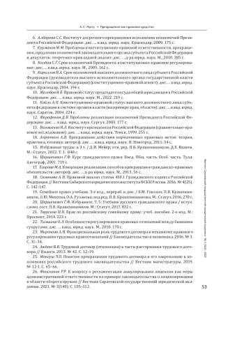 14. 	Апряткин А. В. Прекращение действия нормативных правовых актов: теория, практика, техника: автореф. дис. … канд. юрид. наук. Н. Новгород, 2011. 34 с. EDN: ZOJJLV