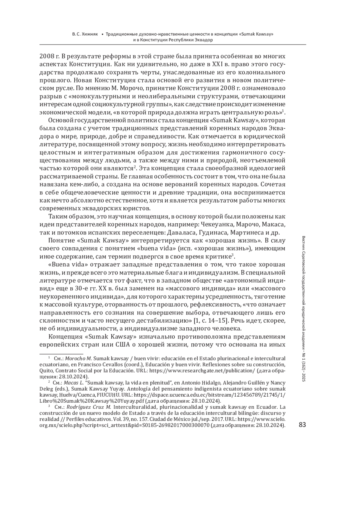 Введение: в настоящее время одним из актуальных вопросов развития отечественной конституционно-правовой политики является охрана и защита традиционных духовно-нравственных ценностей российского общества. Выявление государств, в которых существуют схожие с российскими традиционные духовно-нравственные ценности и опыт их законодательного закрепления, может способствовать развитию отечественной науки конституционного права и конституционно-правовой политики. Цель - рассмотреть особенности закрепления традиционных духовно-нравственных ценностей в конституционном праве и юридической науке в Республике Эквадор и выявить возможности заимствования опыта.