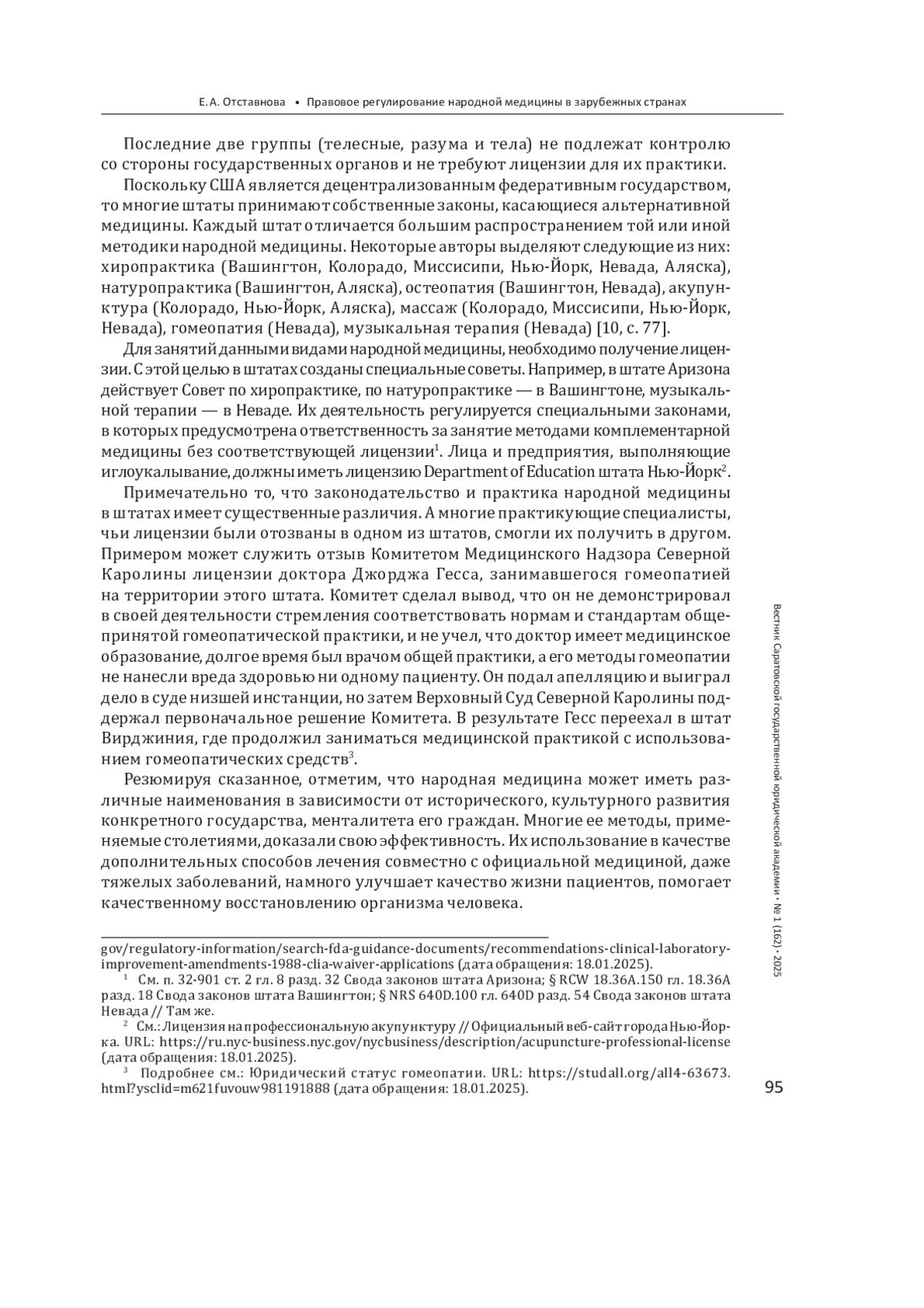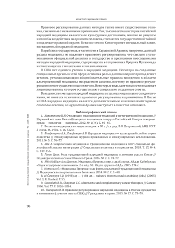 10. Нагорная И. И. Правовое регулирование народной медицины в России нуждается в изменении (с учетом опыта США) // Гражданин и право. 2015. № 17. С. 73-79. EDN: VBTTBD