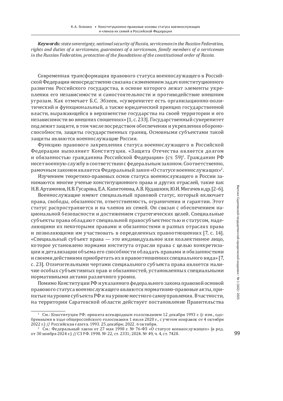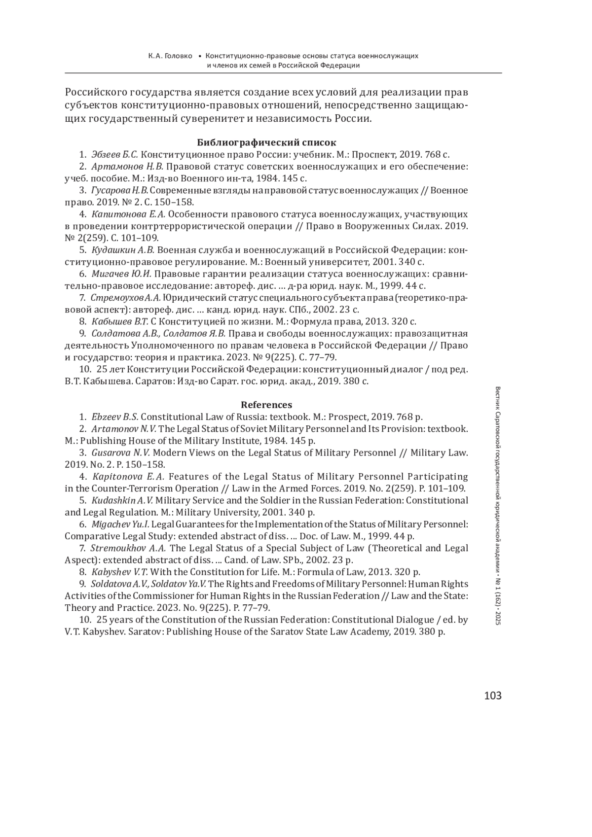 3. 	Гусарова Н. В. Современные взгляды на правовой статус военнослужащих // Военное право. 2019. № 2. С. 150-158. EDN: CKBFRC