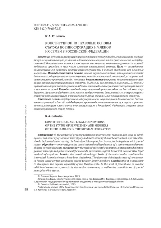 Результаты: раскрыта конституционно-правовая основа рассматриваемого статуса. Выделены его основные элементы. Элементы правового статуса военнослужащих в России при определенных условиях распространяются и на членов их семей.