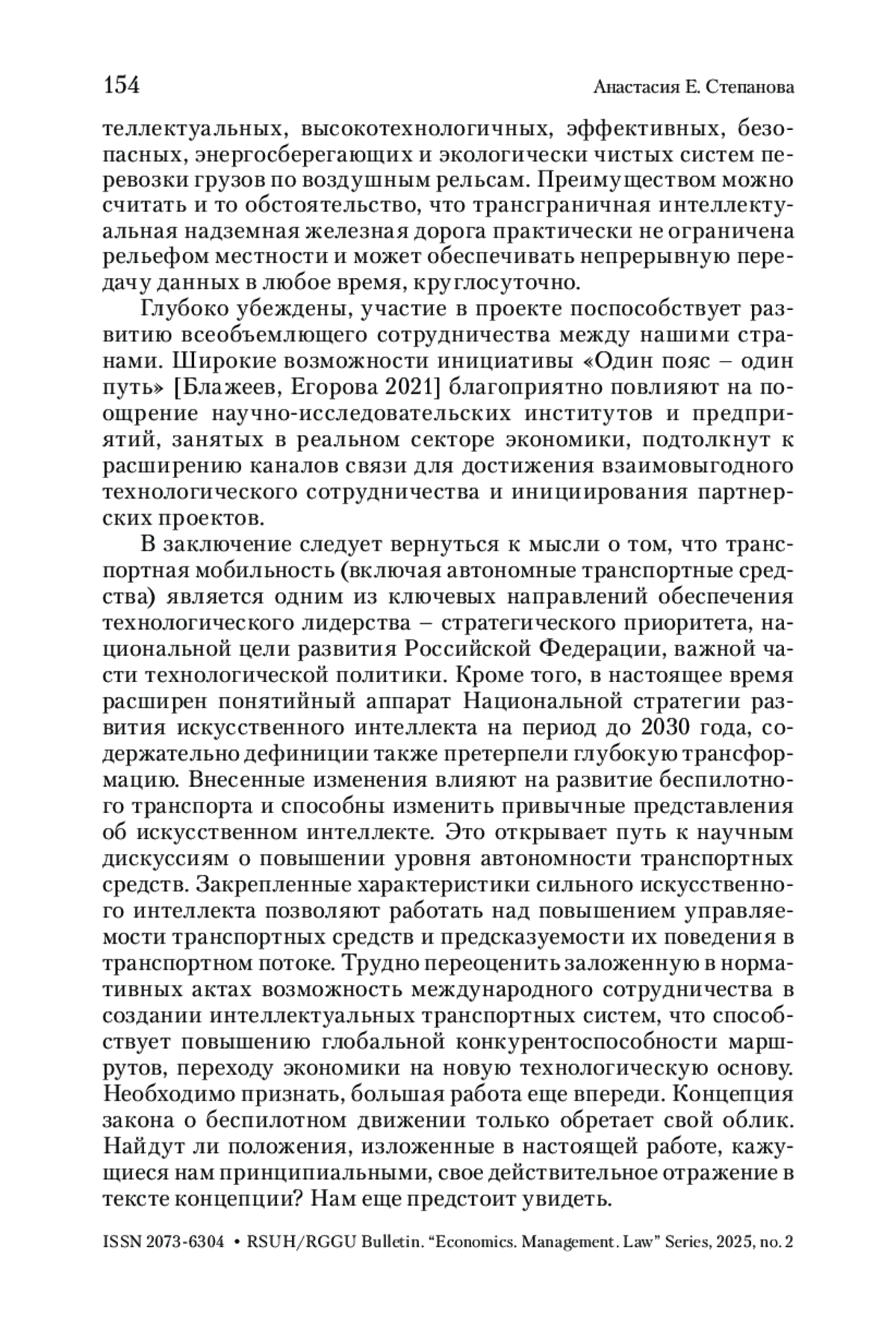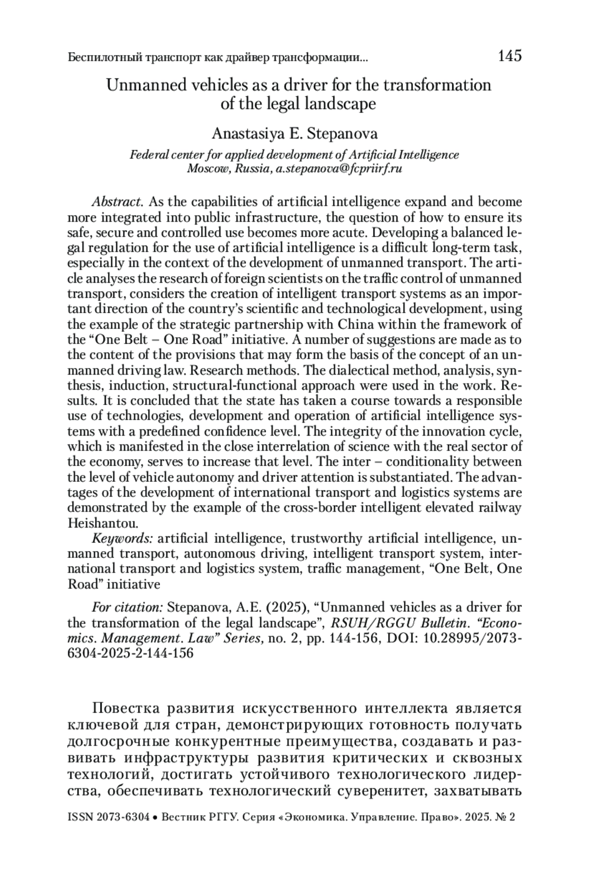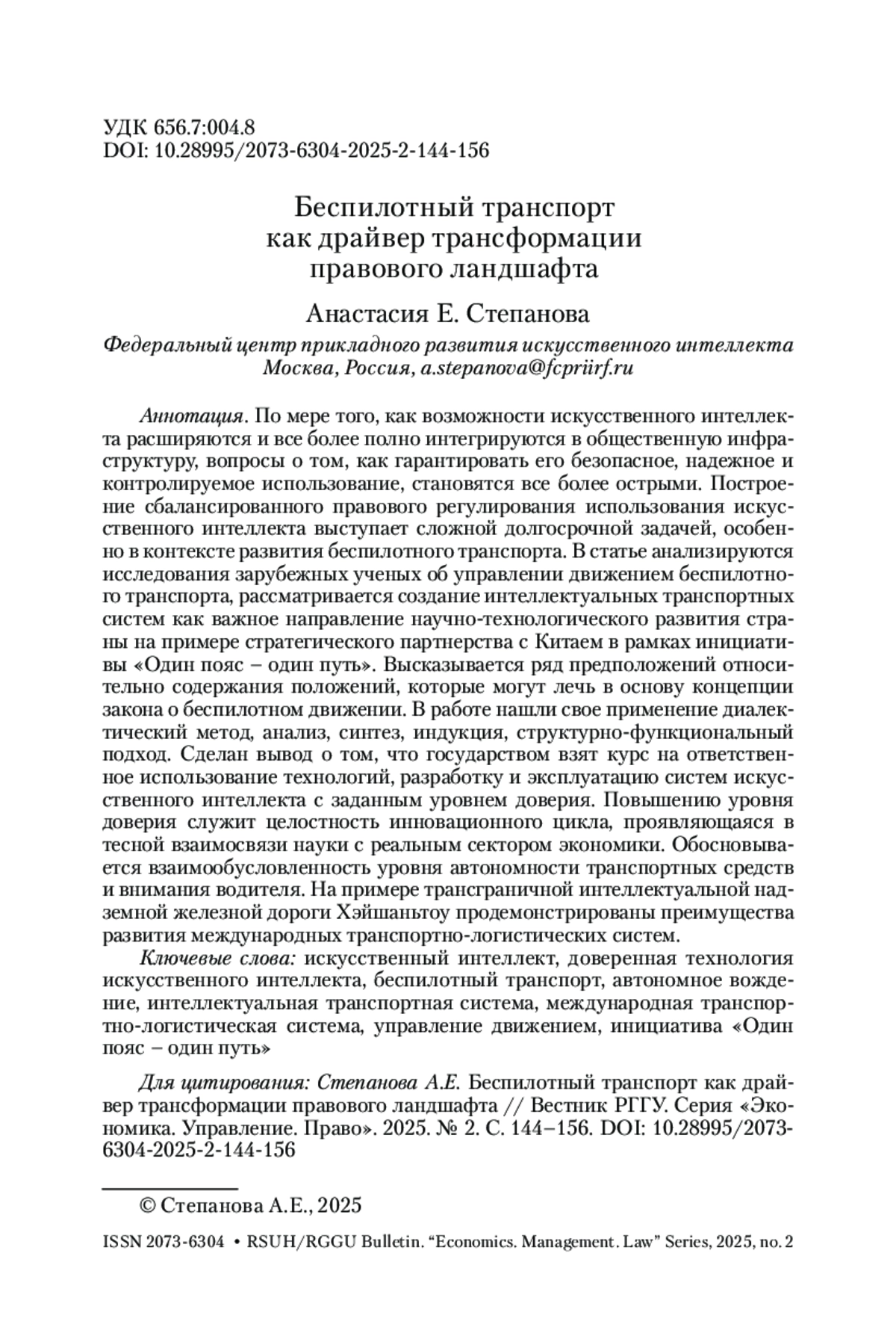 По мере того, как возможности искусственного интеллекта расширяются и все более полно интегрируются в общественную инфраструктуру, вопросы о том, как гарантировать его безопасное, надежное и контролируемое использование, становятся все более острыми. Построение сбалансированного правового регулирования использования искусственного интеллекта выступает сложной долгосрочной задачей, особенно в контексте развития беспилотного транспорта. В статье анализируются исследования зарубежных ученых об управлении движением беспилотного транспорта, рассматривается создание интеллектуальных транспортных систем как важное направление научно-технологического развития страны на примере стратегического партнерства с Китаем в рамках инициативы «Один пояс – один путь». Высказывается ряд предположений относительно содержания положений, которые могут лечь в основу концепции закона о беспилотном движении. В работе нашли свое применение диалектический метод, анализ, синтез, индукция, структурно-функциональный подход. Сделан вывод о том, что государством взят курс на ответственное использование технологий, разработку и эксплуатацию систем искусственного интеллекта с заданным уровнем доверия. Повышению уровня доверия служит целостность инновационного цикла, проявляющаяся в тесной взаимосвязи науки с реальным сектором экономики. Обосновывается взаимообусловленность уровня автономности транспортных средств и внимания водителя. На примере трансграничной интеллектуальной надземной железной дороги Хэйшаньтоу продемонстрированы преимущества развития международных транспортно-логистических систем.
