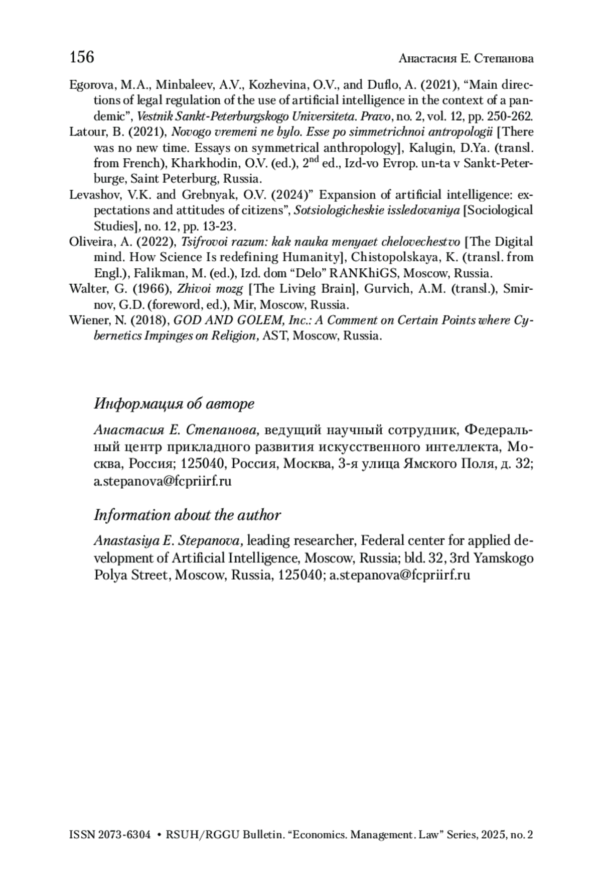 5. Егорова и др. 2021 - Егорова М.А., Минбалеев А.В., Кожевина О.В., Дюфло А. Основные направления правового регулирования использования искусственного интеллекта в условиях пандемии // Вестник Санкт-Петербургского университета. Право. 2021. № 2. Т. 12. С. 250-262.