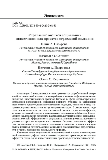 В предлагаемой статье приводится разработанный авторский методический подход и его апробация к оценке эффективности социальных инвестиционных проектов (проект в сфере здравоохранения отраслевой корпорации), концепция которого строится на устранении недостатков существующих методических подходов, таких как метод «затраты-результативность» и метод «затраты-выгоды». В основе такого подхода лежит авторская система показателей оценки социального эффекта, а также авторский подход к монетизации социальных эффектов. Проведенное исследование позволило разработать алгоритм оценки социально-экономической эффективности социальных инвестиционных проектов с учетом авторского методического подхода. Перевод социальных эффектов, выраженных в натуральных единицах изменения, в денежное выражение повысил точность оценки социально-экономической эффективности с учетом суммарного социального эффекта.