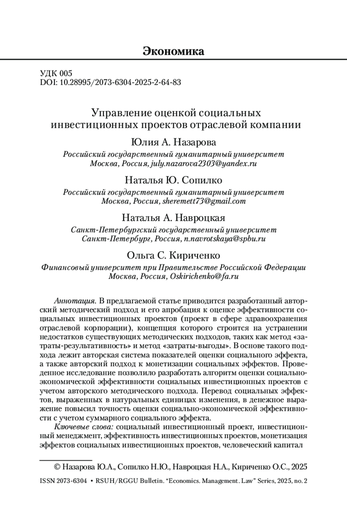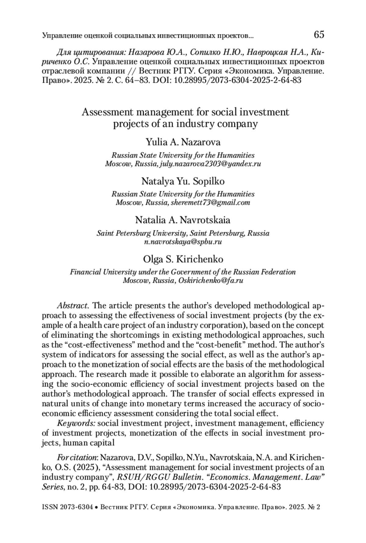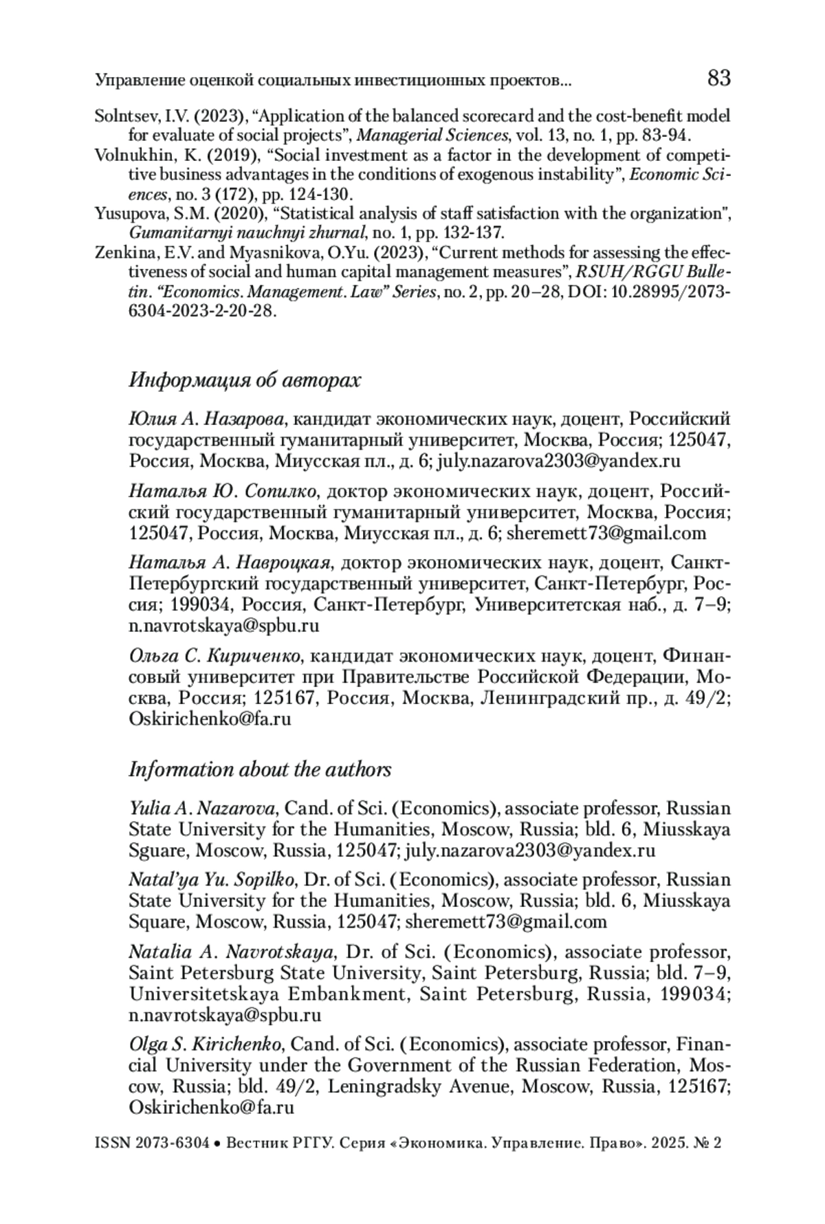 3. Зенкина, Мясникова 2023 - Зенкина Е.В., Мясникова О.Ю. Современные методы оценки эффективности мероприятий по управлению социальным и человеческим капиталом // Вестник РГГУ. Серия: Экономика. Управление. Право. 2023. № 2. С. 20-28. https://doi.org/10.28995/2073-6304-2023-2-20-28.