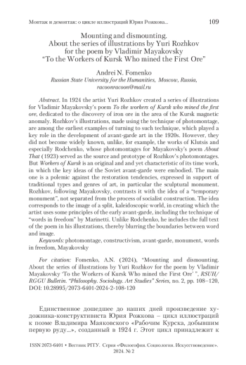 В 1924 г. художник Юрий Рожков создал цикл иллюстраций к поэме Владимира Маяковского «Рабочим Курска, добывшим первую руду…», посвященной открытию железной руды в районе Курской магнитной аномалии. Иллюстрации Рожкова, выполненные в технике фотомонтажа, принадлежат к числу ранних примеров обращения к этой технике, сыгравшей ключевую роль в развитии авангардного искусства 1920-х гг. Однако они не получили широкой известности, в отличие, например, от работ Клуциса и особенно Родченко, чьи фотомонтажи к поэме Маяковского «Про это» (1923) послужили источником и прототипом фотомонтажей Рожкова. Вместе с тем «Рабочие Курска…» – оригинальная и вместе с тем характерная для своего времени работа, в которой нашли воплощение ключевые идеи советского авангарда. Основная из них заключается в полемике против реставраторских тенденций, выражающихся в поддержке традиционных видов и жанров искусства, в частности скульптурного памятника. Рожков, вслед за Маяковским, противопоставляет этому идею «временного памятника», не отделенного от процесса социалистического строительства. Этой идее соответствует образ расщепленного, калейдоскопического мира, создавая который художник использует некоторые принципы раннего авангарда, включая технику «слов на свободе» Маринетти. В отличие от Родченко, он включает в свои иллюстрации полный текст поэмы, размывая тем самым границы между словом и изображением.