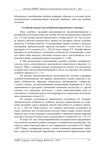 Исследования юридического дискурса не теряют свою актуальность на протяжении нескольких десятилетий. Особым видом юридического дискурса является судебный дискурс. Язык судебных заседаний как основной лингвистический инструмент указанного вида дискурса представляет собой богатый источник данных для социологии, прикладной лингвистики, социолингвистики, прагмалингвистики и других смежных дисциплин. Дискурсивные исследования общего плана связаны с изучением языковых особенностей судебных заседаний в частности, а также специфики делового общения и правовой культуры юристов в целом [1], в то время как лингвистические исследования судебного дискурса направлены на прагмакоммуникативный анализ ролей участников судебного заседания и применяемых ими стратегий [2].