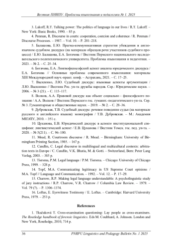 4. 	Penman, R. Discourse in courts: cooperation, coercion and coherence / R. Penman // Discourse Processes. - 1987. - Vol. 10. - P. 201-218.