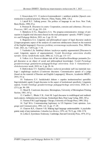 7. 	Василенко, Л.Ю. Судебный дискурс: языковые аспекты аргументации / Л.Ю. Василенко // Вестник Рос. ун-та дружбы народов. Сер.: Юридические науки. - 2006. - № 3 (21). - С. 115-117.