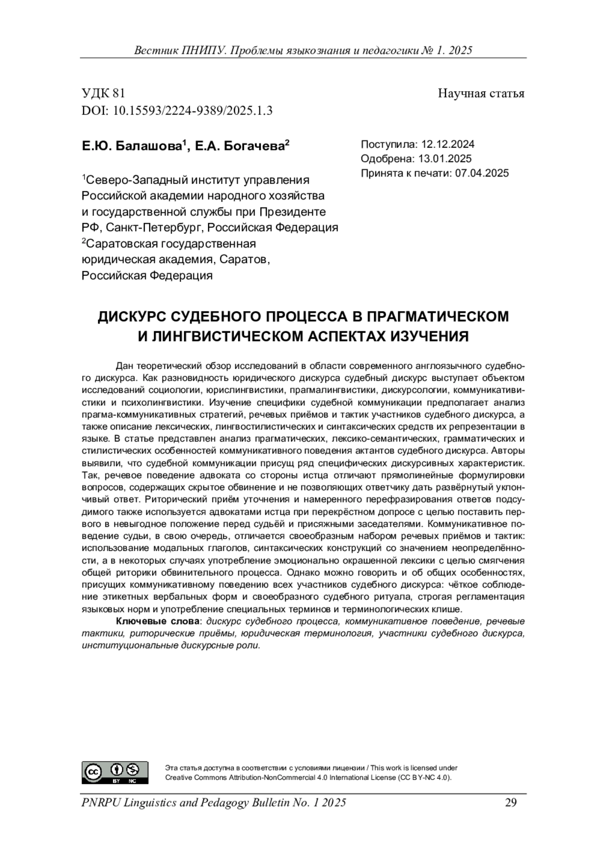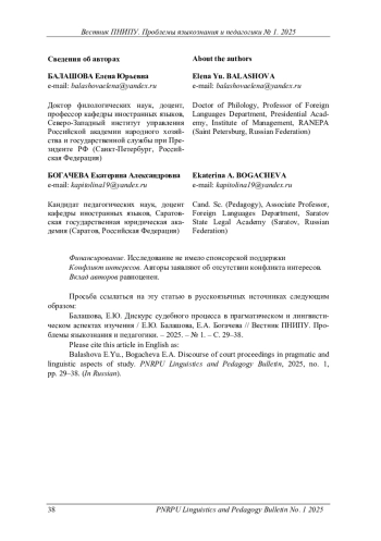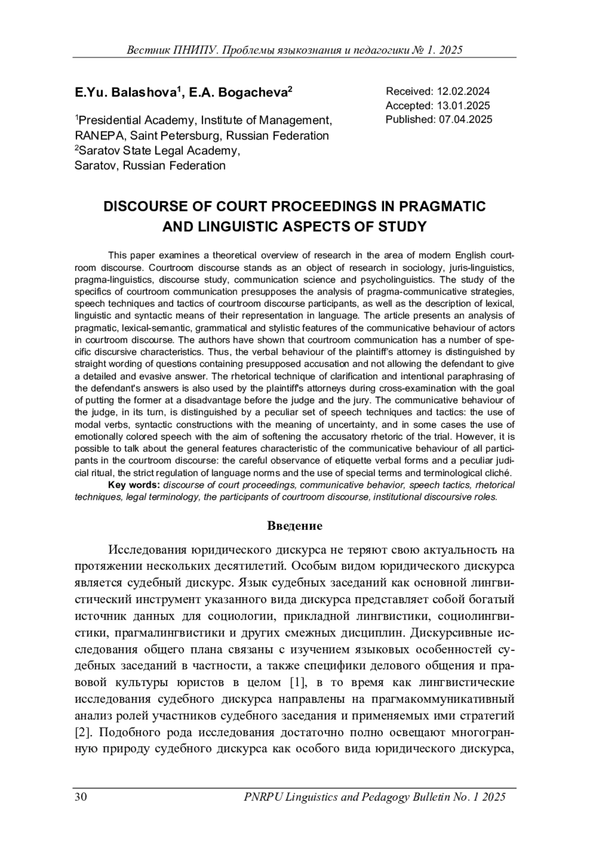 5. 	Балашова, Е.Ю. Прагма-коммуникативная стратегия убеждения в англоязычном судебном дискурсе (на материале образцов речи участников судебного процесса) / Е.Ю. Балашова, Е.А. Богачева // Вестник Пермского национального исследовательского политехнического университета. Проблемы языкознания и педагогики. - 2023. - № 2. - С. 25-34.