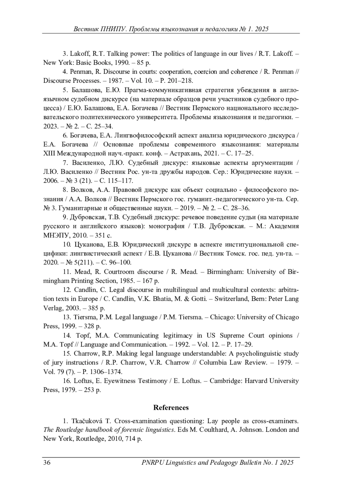 1. 	Tkačuková, T. Cross-examination questioning: Lay people as cross-examiners / T. Tkačuková // The Routledge Handbook of Forensic Linguistics / ed. by M. Coulthard and A. Johnson. - London and New York: Routledge, 2010. - 714 p.