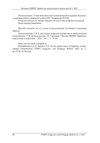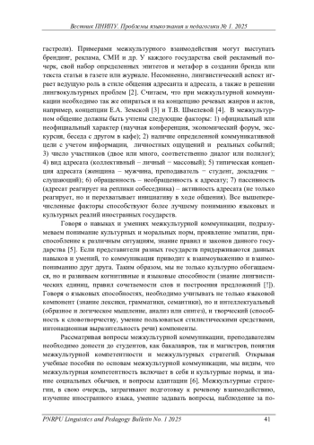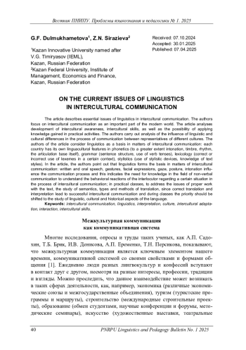 Рассматриваются актуальные вопросы лингвистики в межкультурной коммуникации. Авторы статьи акцентируют особое внимание на межкультурной коммуникации как важной части общения в современном мире. В статье обсуждаются вопросы развития межкультурной осведомленности, необходимости развития межкультурных навыков и умений, а также возможности применения полученных знаний в практической деятельности. Проводится анализ влияния языковых и культурных различий в процессе общения между представителями разных культур. Авторы статьи рассматривают лингвистику как основу в вопросах межкультурной коммуникации: в каждой стране есть свои лингвокультурные особенности в фонетике (в большей степени интонация, тембр, ритм, сама артикуляционная база), грамматике (структура предложения, использование времен глагола), лексикологии (правильное или неправильное использование лексем в определенном контексте), стилистике (использование фигур речи, знание стилей текста). Авторы акцентируют внимание на том, что письменная и устная речь, жесты, мимика, взгляд, поза, интонация непосредственно влияют на процесс коммуникации, что свидетельствует о необходимости формирования знаний в области невербальной коммуникации для понимания поведенческих реакций собеседника в заданной ситуации межкультурной коммуникации. Особенно важно на практических занятиях затрагивать вопросы системной работы с текстом, изучения семантики, видов и способов перевода, отдавая приоритет изучению лингвокультурных и исторических аспектов языка