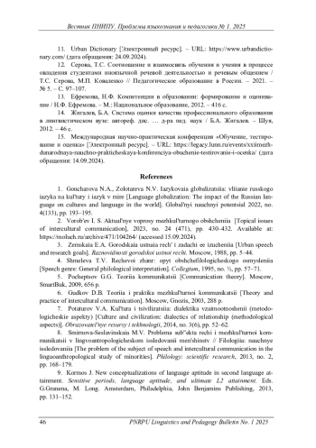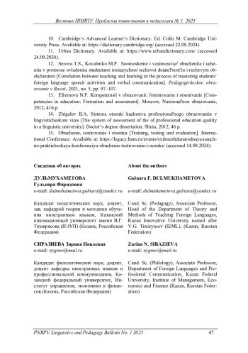 12. Серова, Т.С. Соотношение и взаимосвязь обучения и учения в процессе овладения студентами иноязычной речевой деятельностью и речевым общением / Т.С. Серова, М.П. Коваленко // Педагогическое образование в России. - 2021. - № 5. - С. 97-107.