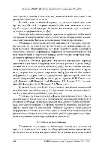 Дано описание технологии гибкого профессионально ориентированного переводческого чтения. В качестве исходных понятий принимаются «смысловое решение», «речевой поступок», «речедеятельностная единица письменного технического перевода» и др. Важной методологической основной выступает теория В. Д. Шадрикова о сложной структуре целеполагания. Обоснована необходимость включения во все упражнения и коммуникативно-речевые задачи целого, связного, осмысленного текста и его единиц. Сформулированы условия овладения знаниями, операциями и речевыми навыками. Для раскрытия специфики переводческого осмысления и понимания авторами раскрывается содержание ряда принципиальных вопросов о видах смысловых связей, роли информативного чтения как общения-диалога, последовательности осуществления речевых операций, речевых действий и речевой деятельности чтения во взаимосвязи с речевой деятельностью репродуктивного и продуктивного, творческого письма. В качестве ведущего типа структуры программы смыслового содержания при этом предлагается денотатная структура. Подробно изложена последовательность шагов, составляющих технологию обучения профессиональному переводческому чтению, которые предполагают выявление, осмысление, понимание всех мыслей каждого фрагмента, в своей совокупности образующих программу его смыслового содержания. В ходе исследования получила подтверждение гипотеза о том, что представленный способ выявления и фиксации лексем, объединенных по смыслу в денотатах, является наиболее эффективным способом на начальном этапе по сравнению со способом выявления, осмысления и формирования тема-рематических единств. Эффективность предложенной технологии обучения выявлению и пониманию всех смысловых связей в речевых фрагментах обусловлена строгой последовательностью и интеграцией разнохарактерных операций: речевых лексических операций в процессе действий информативного чтения и письма-фиксации, речемыслительных операций выявления сочетаемостно-синтагматических отношений между словами, речемыслительных операций думания и выделения слов в группу «тема» и «рема», лексико-морфологических операций и др.