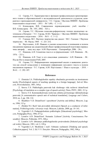 12. Серова, Т.С. Характеристики и функции профессионально-ориентированного чтения в образовательной и исследовательской деятельности студентов, аспирантов и преподавателей университета / Т.С. Серова // Вестник ПНИПУ. Проблемы языкознания и педагогики. - 2013. - № 7 (49). - С. 3-12.