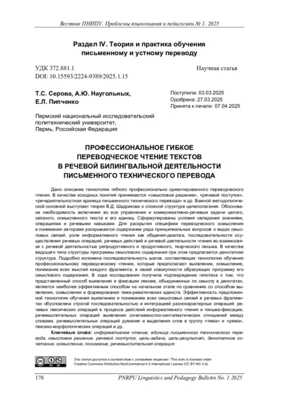 11. Серова, Т.С. Актуализация смысловых связей при обучении осмыслению, пониманию информации исходных текстов и порождению текстов письменного технического перевода / Т.С. Серова // Вестник ПНИПУ. Проблемы языкознания и педагогики. - 2022. - № 4. - С. 121-139.