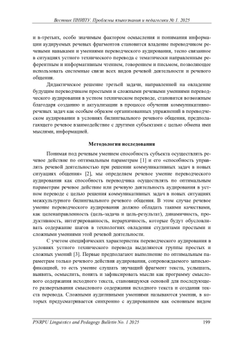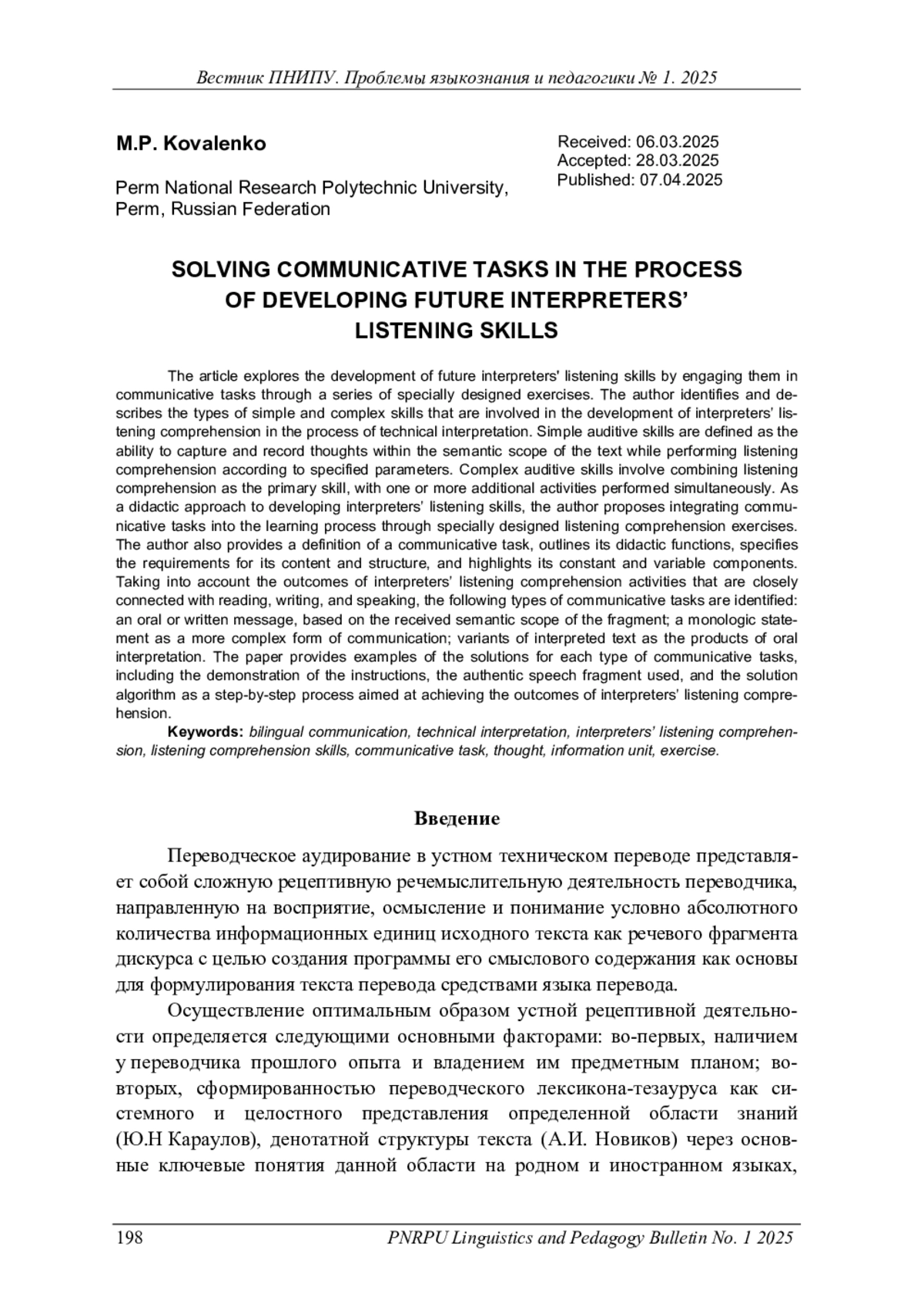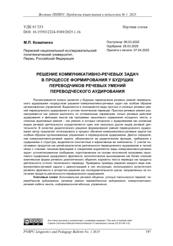 Рассматривается вопрос развития у будущих переводчиков речевых умений переводческого аудирования посредством решения коммуникативно-речевых задач как особым образом организованных упражнений. Выделяются и описываются виды простых и сложных речевых умений переводческого аудирования в устном техническом переводе. Простые речевые умения рассматриваются как умения выполнять по оптимальным параметрам только речевые действия аудирования и фиксации мысли как программы смыслового содержания исходного текста, а сложные аудитивные умения – как умения, в которых синхронно с аудированием как основным видом речевой деятельности осуществляется один или несколько других видов речевой деятельности. В качестве дидактического решения формирования умений переводческого аудирования автор предлагает интегрировать в процесс обучения коммуникативно-речевые задачи как особым образом организованные упражнения в переводческом аудировании. Дается определение коммуникативно-речевой задачи, обозначаются ее дидактические функции, требования к содержанию и структуре, выделяются константные и вариативные ее компоненты. С учетом получаемых продуктов как целей-результатов деятельности переводческого аудирования в тесной связи с чтением, письмом-фиксацией и говорением выделяются виды коммуникативно-речевых задач: устное/письменное сообщение, подготовленное на основе полученной программы смыслового содержания аудируемого фрагмента; монологическое высказывание как более сложная комплексная форма речевого диалогического общения; варианты текста перевода как продукты деятельности устного технического перевода. Приведены примеры решения каждого вида коммуникативно-речевой задачи с демонстрацией в них инструкции, используемого аутентичного речевого фрагмента и алгоритма решения как последовательности шагов, направленных на получение продукта деятельности переводческого аудирования.