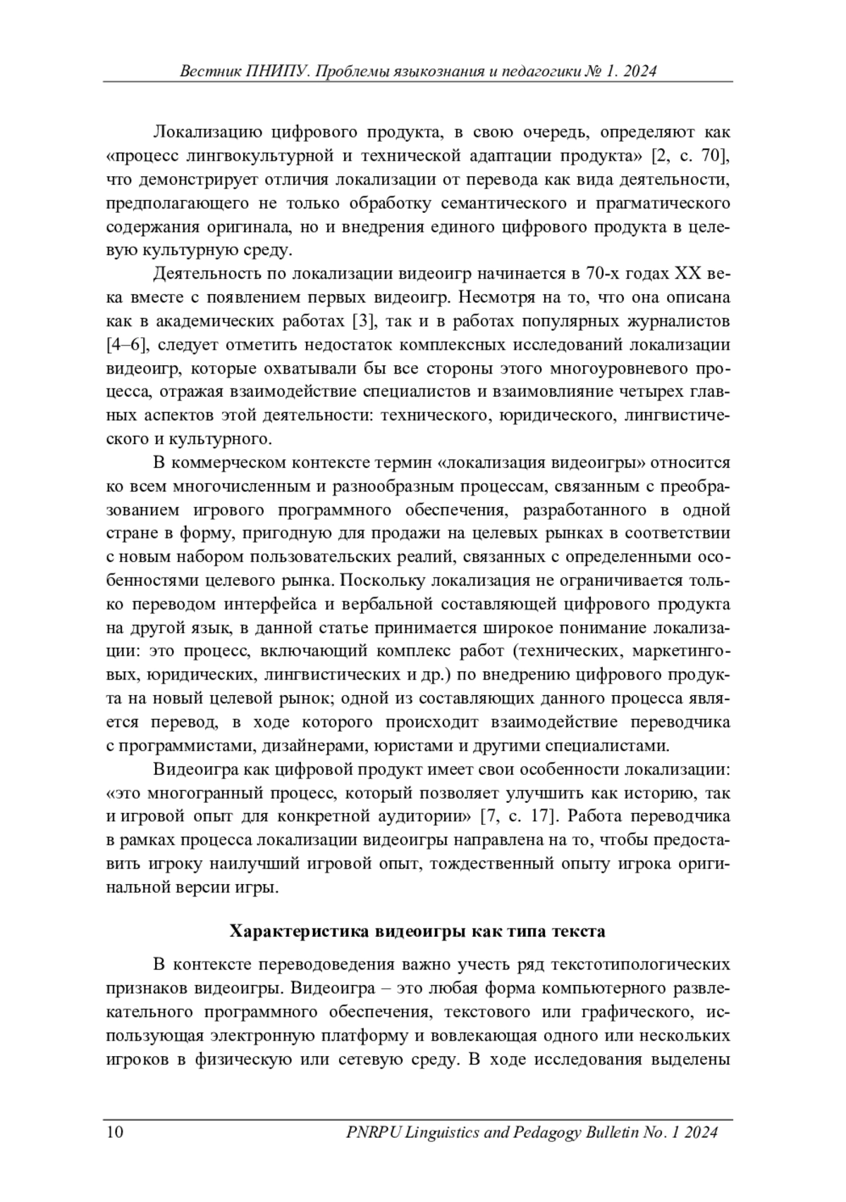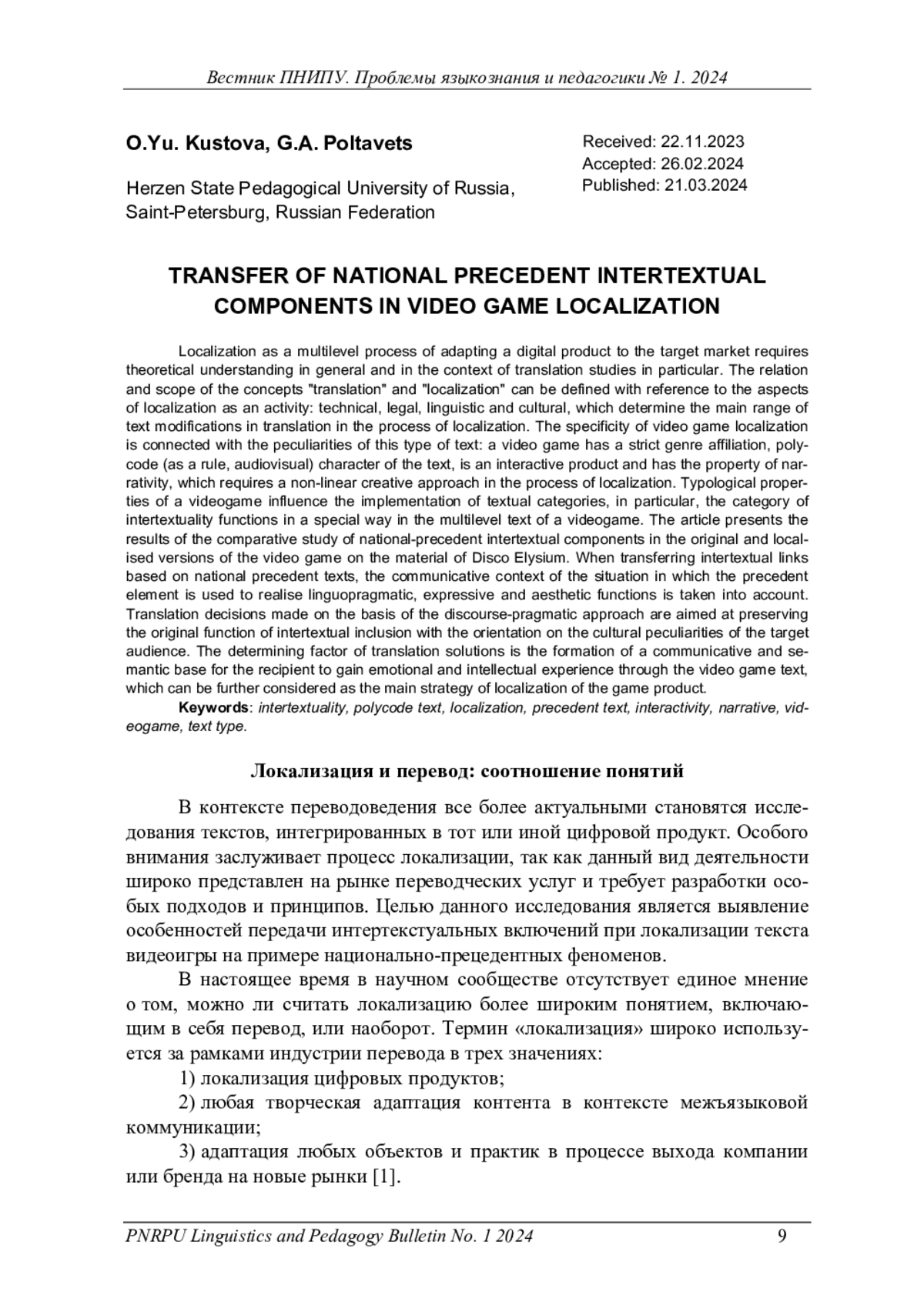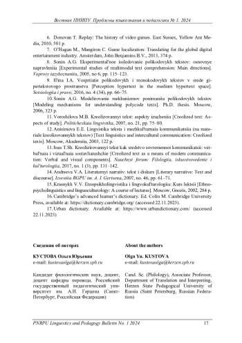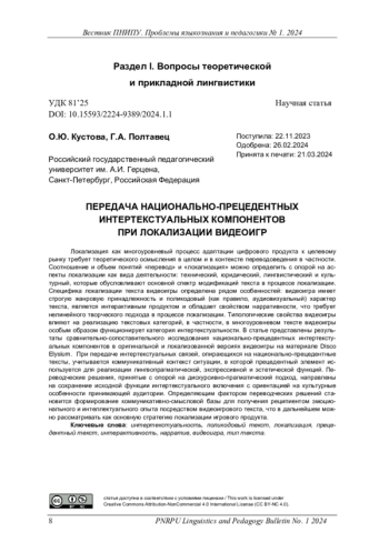 Локализация как многоуровневый процесс адаптации цифрового продукта к целевому рынку требует теоретического осмысления в целом и в контексте переводоведения в частности. Соотношение и объем понятий «перевод» и «локализация» можно определить с опорой на аспекты локализации как вида деятельности: технический, юридический, лингвистический и культурный, которые обусловливают основной спектр модификаций текста в процессе локализации. Специфика локализации текста видеоигры определена рядом особенностей: видеоигра имеет строгую жанровую принадлежность и поликодовый (как правило, аудиовизуальный) характер текста, является интерактивным продуктом и обладает свойством нарративности, что требует нелинейного творческого подхода в процессе локализации. Типологические свойства видеоигры влияют на реализацию текстовых категорий, в частности, в многоуровневом тексте видеоигры особым образом функционирует категория интертекстуальности. В статье представлены результаты сравнительно-сопоставительного исследования национально-прецедентных интертекстуальных компонентов в оригинальной и локализованной версиях видеоигры на материале Disco Elysium. При передаче интертекстуальных связей, опирающихся на национально-прецедентные тексты, учитывается коммуникативный контекст ситуации, в которой прецедентный элемент используется для реализации лингвопрагматической, экспрессивной и эстетической функций. Переводческие решения, принятые с опорой на дискурсивно-прагматический подход, направлены на сохранение исходной функции интертекстуального включения с ориентацией на культурные особенности принимающей аудитории. Определяющим фактором переводческих решений становится формирование коммуникативно-смысловой базы для получения реципиентом эмоционального и интеллектуального опыта посредством видеоигрового текста, что в дальнейшем можно рассматривать как основную стратегию локализации игрового продукта