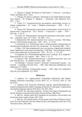 2. 	Саяхова, Д.К. Языковая локализация видеоигр: лингвокультурологический и когнитивно-прагматический аспекты: дис. … канд. филол. наук / Д.К. Саяхова. - Уфа, 2021. - 189 с.  EDN: KVTWJA