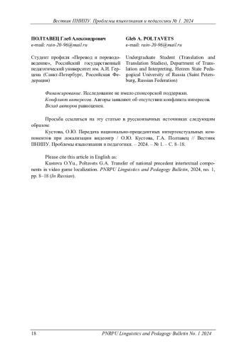 В контексте переводоведения все более актуальными становятся исследования текстов, интегрированных в тот или иной цифровой продукт. Особого внимания заслуживает процесс локализации, так как данный вид деятельности широко представлен на рынке переводческих услуг и требует разработки особых подходов и принципов. Целью данного исследования является выявление особенностей передачи интертекстуальных включений при локализации текста видеоигры на примере национально-прецедентных феноменов