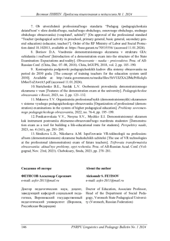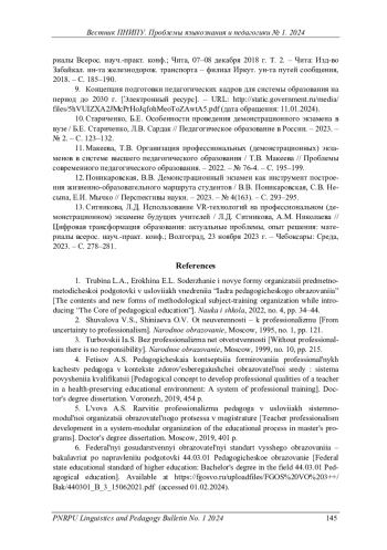 10. Стариченко, Б.Е. Особенности проведения демонстрационного экзамена в вузе / Б.Е. Стариченко, Л.В. Сардак // Педагогическое образование в России. - 2023. - № 2. - С. 123-132. EDN: GKZNCD