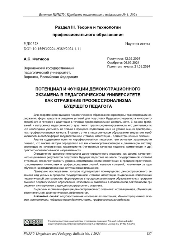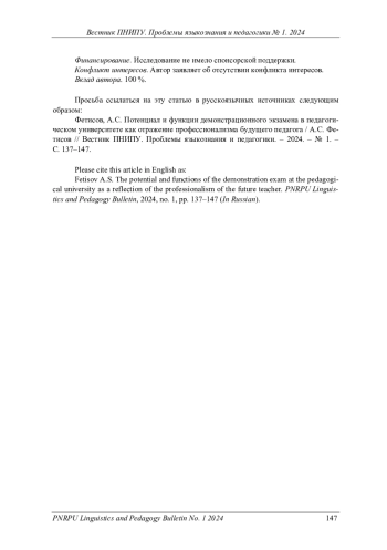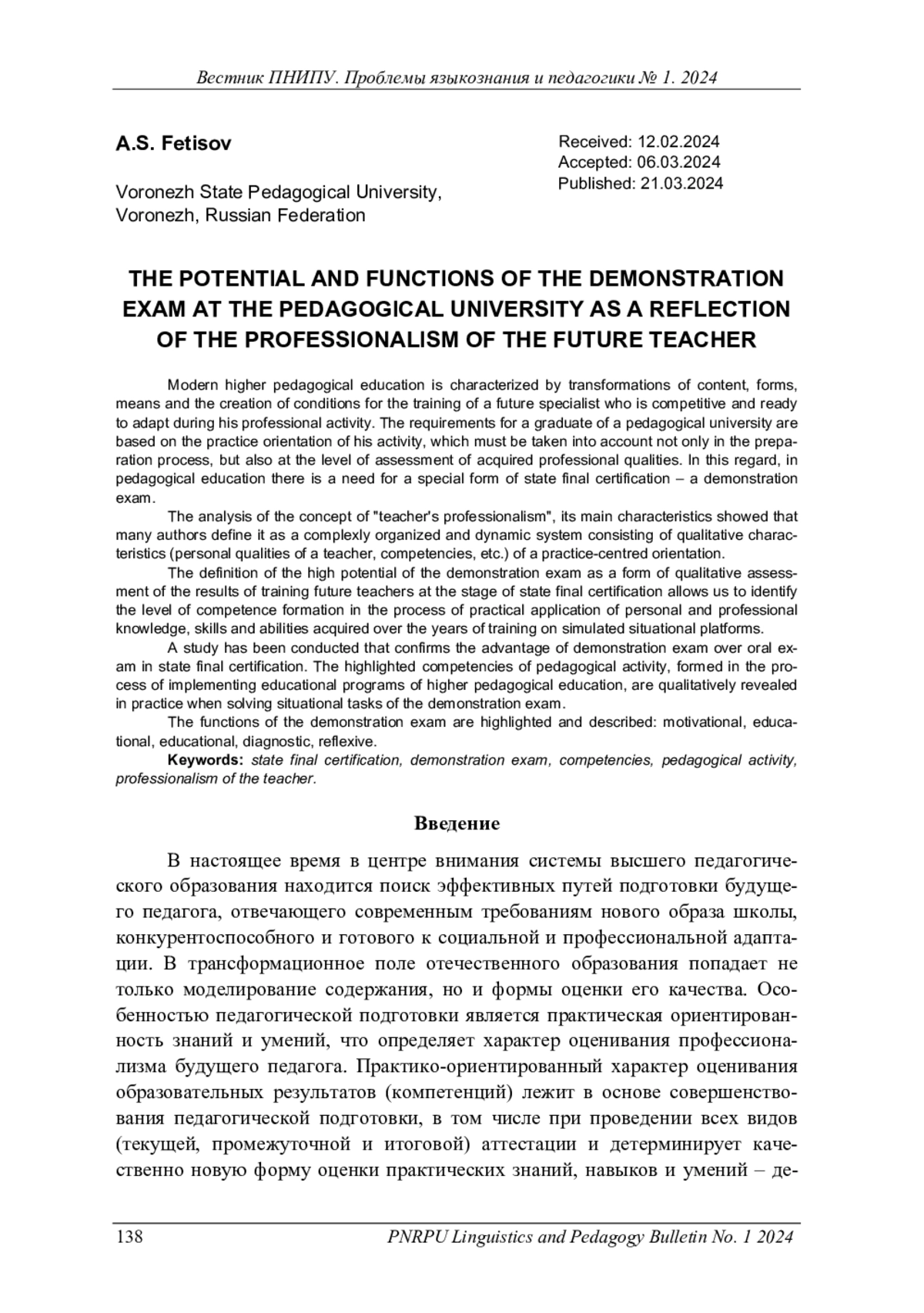 Для современного высшего педагогического образования характерны трансформации содержания, форм, средств и создание условий для подготовки будущего специалиста конкурентоспособного и готового к адаптации в течение профессиональной деятельности. В основе требований к выпускнику педагогического вуза лежит практикоориентированность его деятельности, что необходимо учитывать не только в процессе подготовки, но и на уровне оценки приобретенных профессиональных качеств. В связи с этим в педагогическом образовании возрастает необходимость в особой форме государственной итоговой аттестации – демонстрационный экзамен. Анализ содержания понятия «профессионализм педагога», его основных характеристик показал, что многие авторы определяют его как сложноорганизованную и динамичную систему, состоящую из качественных характеристик (личностные качества педагога, компетенции и др.) практико-ориентированной направленности. Определение высокого потенциала демонстрационного экзамена как формы качественного оценивания результатов подготовки будущих педагогов на этапе государственной итоговой аттестации позволяет выявить уровень сформированности компетенций в процессе практического применения личностных и профессиональных знаний, навыков и умений, полученных за годы обучения на смоделированных ситуационных площадках. Проведено исследование, которое подтверждает преимущество демонстрационного экзамена над устным в процессе государственной итоговой аттестации. Выделенные компетенции педагогической деятельности, формируемые в процессе реализации образовательных программ высшего педагогического образования, качественно выявлены в практической деятельности при решении ситуационных задач демонстрационного экзамена. Выделены и описаны функции демонстрационного экзамена: мотивационная, обучающая, воспитательная, диагностическая, рефлексивная