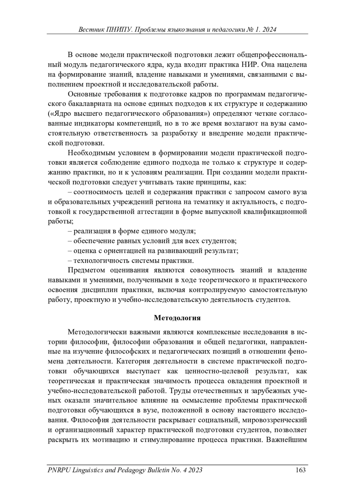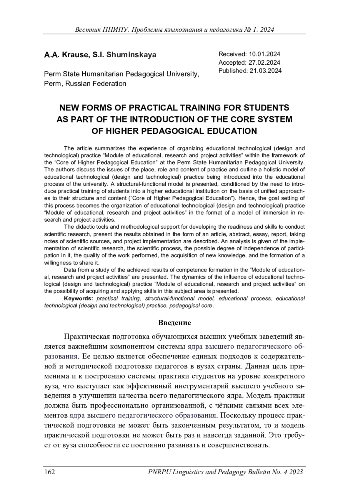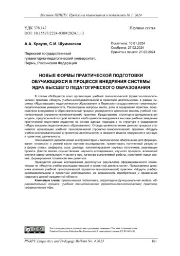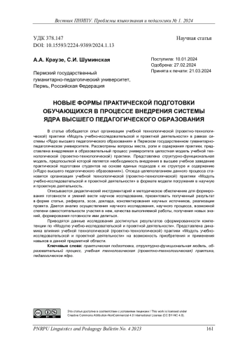 В статье обобщается опыт организации учебной технологической (проектно-технологической) практики «Модуль учебно-исследовательской и проектной деятельности» в рамках системы «Ядро высшего педагогического образования» в Пермском государственном гуманитарнопедагогическом университете. Рассмотрены вопросы места, роли и содержания практики, представлена внедряемая в образовательный процесс университета целостная модель учебной технологической (проектно-технологической) практики. Представлена структурно-функциональная модель, предпосылкой которой является необходимость внедрения в высшее учебное заведение практической подготовки студентов на основе единых подходов к их структуре и содержанию («Ядро высшего педагогического образования»). Отсюда целеполаганием данного процесса становится организация учебной технологической (проектно-технологической) практики «Модуль учебно-исследовательской и проектной деятельности» в формате модели погружения в научную и проектную деятельность. Описываются дидактический инструментарий и методическое обеспечение для формирования готовности и умений вести научное исследование, презентовать полученный результат в форме статьи, реферата, эссе, доклада, конспектирования научных источников, реализации проекта. Дается анализ осуществления научного исследования, научного процесса, возможной степени самостоятельности участия в нем, качества выполняемой работы, получения новых знаний, формирования готовности ими делиться. Приводятся данные исследования достигнутых результатов сформированности компетенции по «Модулю учебно-исследовательской и проектной деятельности». Представлена динамика влияния учебной технологической (проектно-технологической) практики «Модуль учебноисследовательской и проектной деятельности» на возможность приобретения и применения навыков в данной предметной области