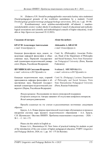 14. 	Жданова, С.Н. Социально-педагогические основания картины мира студентами / С.Н. Жданова // Вестник Оренбург. гос. пед. ун-та. - 2012. - № 3. - С. 89-94.  EDN: PEKCPD