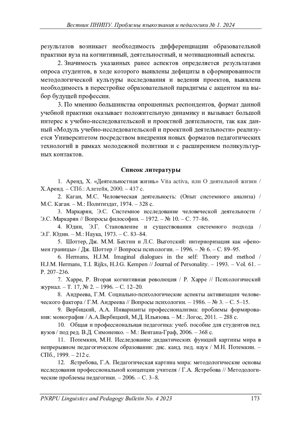 12. 	Ястребова, Г.А. Педагогическая картина мира: методологические основы исследования профессиональной концепции учителя / Г.А. Ястребова // Методологические проблемы педагогики. - 2006. - С. 3-8.