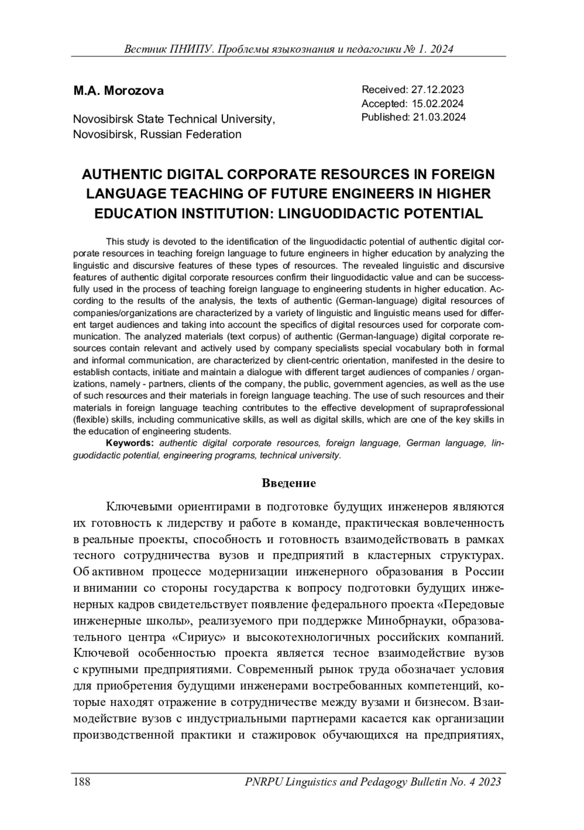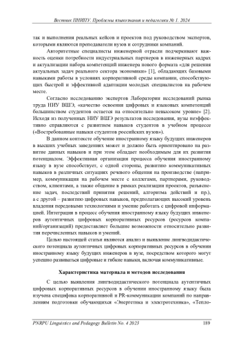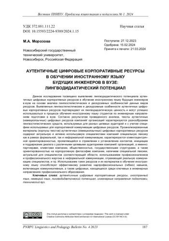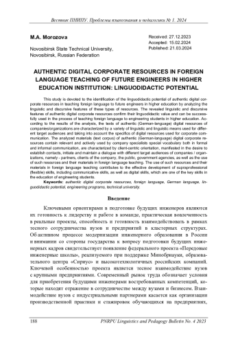 Данное исследование посвящено выявлению лингводидактического потенциала аутентичных цифровых корпоративных ресурсов в обучении иностранному языку будущих инженеров в вузе на основе анализа лингвостилистических и дискурсивных особенностей данных видов ресурсов. Выявленные лингвостилистические и дискурсивные особенности аутентичных цифровых корпоративных ресурсов подтверждают их лингводидактическую ценность и могут успешно использоваться в процессе обучения иностранному языку студентов по инженерным направлениям подготовки в вузе. Согласно результатам проведенного анализа, тексты аутентичных (немецкоязычных) цифровых ресурсов компаний/ организаций характеризуются разнообразием лингвостилистических средств, используемых для разных целевых аудиторий и с учетом специфики используемых для корпоративной коммуникации цифровых ресурсов. Проанализированные материалы (корпусы текстов) аутентичных (немецкоязычных) цифровых корпоративных ресурсов содержат актуальную и активно используемую специалистами компаний специальную лексику как в рамках формальной, так и неформальной коммуникации, характеризуются клиентоцентричной ориентированностью, проявляющейся в стремлении к установлению контактов, инициации и поддержании диалога с различными целевыми аудиториями компаний/ организаций, а именно: партнерами, клиентами компании, общественностью, государственными структурами, а также ориентированностью на корпоративную философию компании, наличием специальной лексики, актуальной для специалистов соответствующей области, использованием профессионализмов и профессионального жаргона в неформальной коммуникации, отражающей реальную коммуникацию специалистов, и пр. Использование таких ресурсов и их материалов в обучении иностранному языку способствует эффективному развитию надпрофессиональных (гибких) навыков, включающих коммуникативные, а также цифровых, находящихся среди ключевых в инженерных направлениях профессионального образования.
