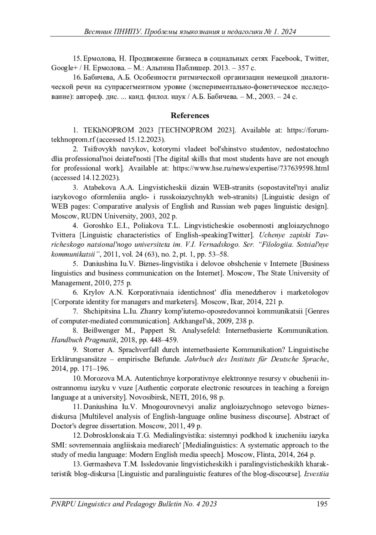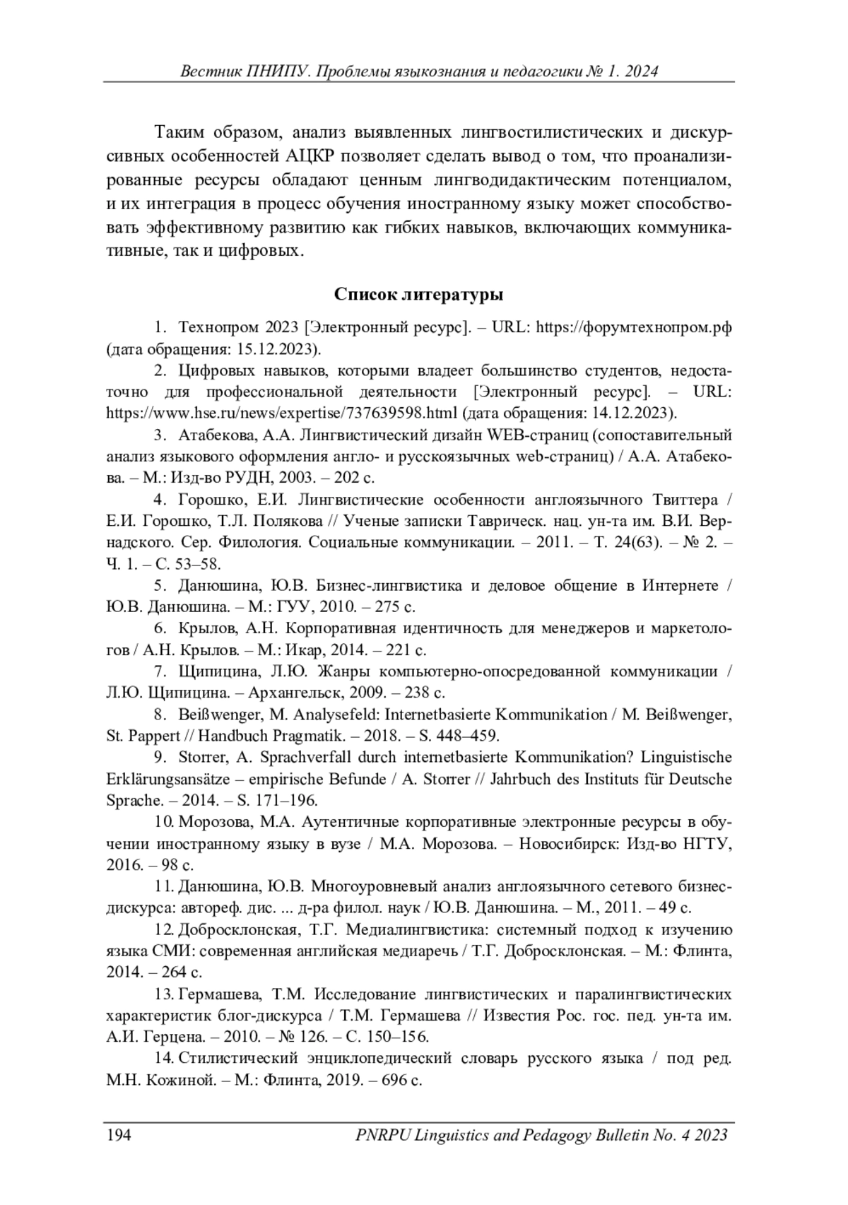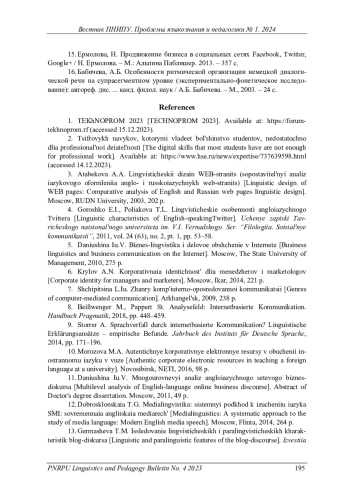 13. Гермашева, Т.М. Исследование лингвистических и паралингвистических характеристик блог-дискурса / Т.М. Гермашева // Известия Рос. гос. пед. ун-та им. А.И. Герцена. - 2010. - № 126. - С. 150-156. EDN: NDALWF