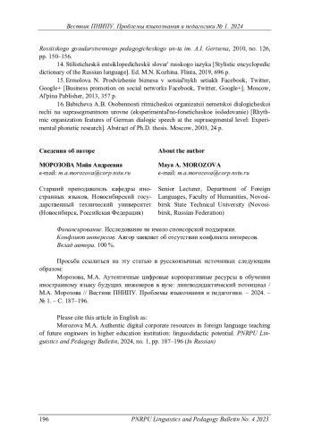 10. Морозова, М.А. Аутентичные корпоративные электронные ресурсы в обучении иностранному языку в вузе / М.А. Морозова. - Новосибирск: Изд-во НГТУ, 2016. - 98 с. EDN: XTGHRR