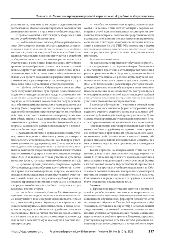 1. Ролевая игра представляет собой игровое моделирование правоотношений, сущность которой заключается в имитации курсантами, исполняющими конкретные процессуальные роли участников стадии судебного разбирательства. Она позволяет соединить знания и умения, перейти на новый уровень познания — привитие навыков.