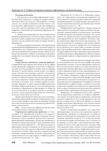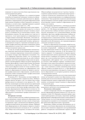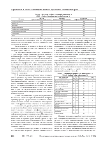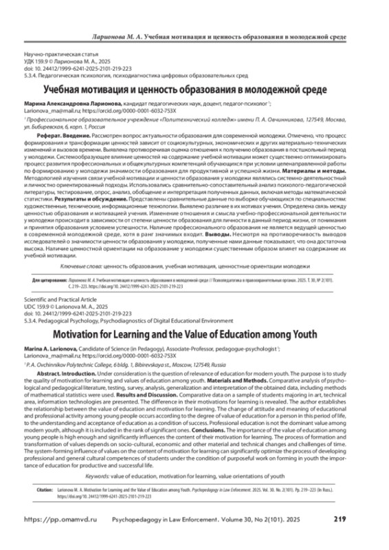 Рассмотрен вопрос актуальности образования для современной молодежи. Отмечено, что процесс формирования и трансформации ценностей зависит от социокультурных, экономических и других материально-технических изменений и вызовов времени. Выявлена противоречивая оценка отношения к получению образования в постшкольный период у молодежи. Системообразующее влияние ценностей на содержание учебной мотивации может существенно оптимизировать процесс развития профессиональных и общекультурных компетенций обучающихся при условии целенаправленной работы по формированию у молодежи значимости образования для продуктивной и успешной жизни. Материалы и методы. Методологией изучения связи учебной мотивации и ценности образования у молодежи являлись системно-деятельностный и личностно ориентированный подходы. Использовались сравнительно-сопоставительный анализ психолого-педагогической литературы, тестирование, опрос, анализ, обобщение и интерпретация полученных данных, включая методы математической статистики. Результаты и обсуждение. Представлены сравнительные данные по выборке обучающихся по специальностям: художественные, технические, информационные технологии. Выявлено различие в их мотивах учения. Определена связь между ценностью образования и мотивацией учения. Изменение отношения и смысла учебно-профессиональной деятельности у молодежи происходит в зависимости от степени ценности образования для личности в данный период жизни, от понимания и принятия образования условием успешности. Наличие профессионального образования не является ведущей ценностью в современной молодежной среде, хотя в ранг значимых входит. Выводы. Несмотря на противоречивость выводов исследователей о значимости ценности образования у молодежи, полученные нами данные показывают, что она достаточна высока. Наличие ценностной ориентации на образование у молодежи существенным образом влияет на содержание их учебной мотивации.