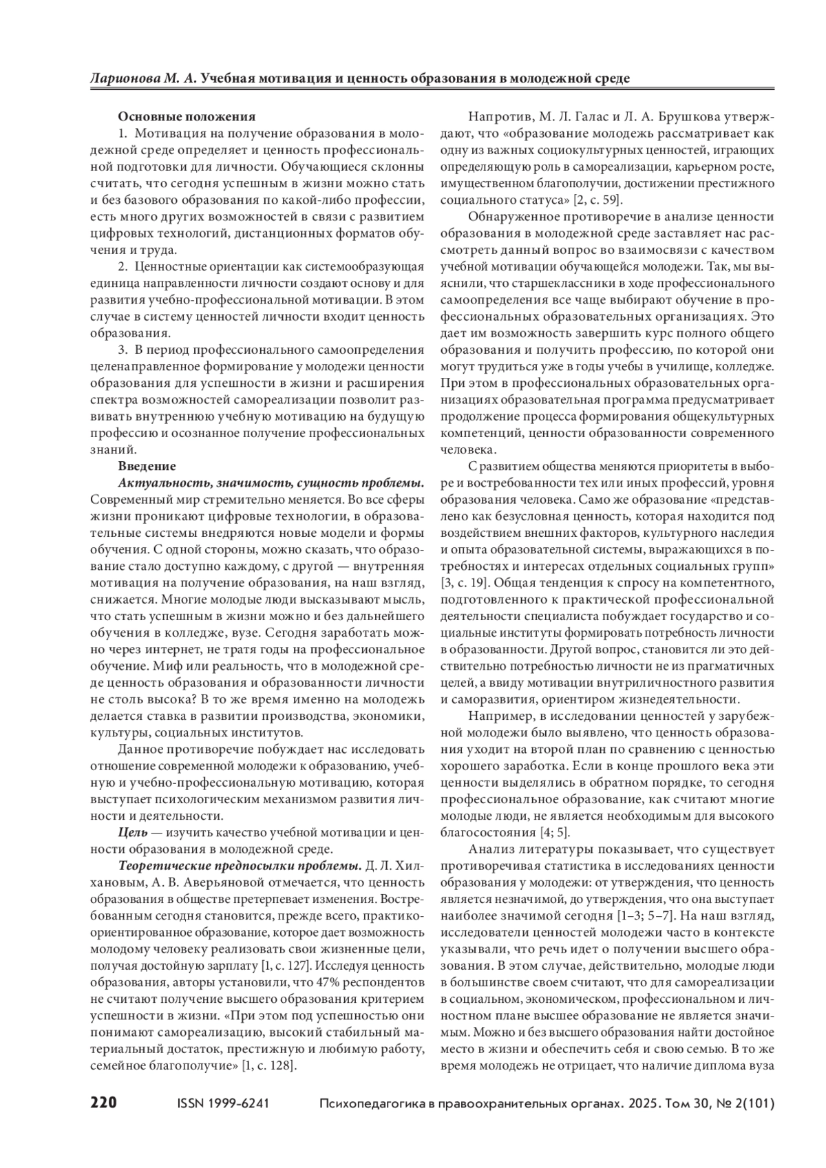 2. Галас М. Л., Брушкова Л. А. Ценность и качество высшего образования в представлениях современной российской молодежи // Наука. Общество. Оборона. 2023. Т. 11, № 4(37). С. 43–63. https://doi.оrg/10.24412/2311-1763-2023-4-43-43.