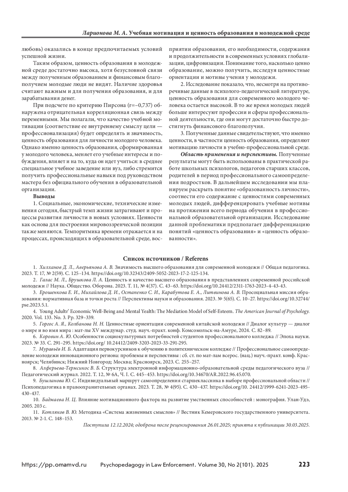 1. Хилханов Д. Л., Аверьянова А. В. Значимость высшего образования для современной молодежи // Общая педагогика. 2023. Т. 17, № 2(59). С. 125–134. https://doi.оrg/10.32343/2409-5052-2023-17-2-125-134.