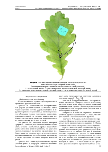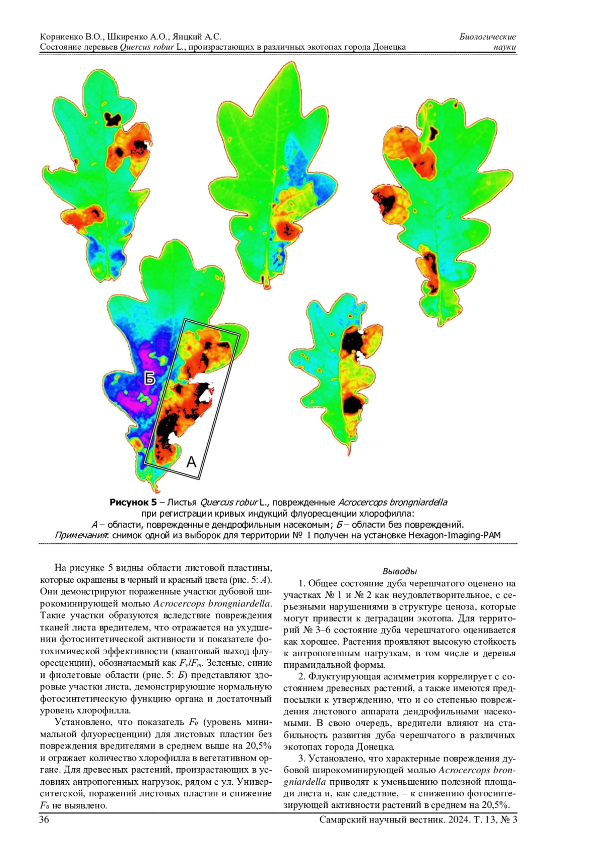 В работе рассмотрены вопросы устойчивости насаждений дуба черешчатого в условиях изменяющегося климата Донбасса. Установлено, что общее состояние Quercus robur L. оценено на территории дендрария Донецкого ботанического сада (экспериментальных дубрав) как неудовлетворительное, с серьезными нарушениями в структуре дендроценоза, которые могут привести к деградации экотопа. Для остальных территорий состояние деревьев дуба черешчатого оценивается как хорошее. Растения, в том числе и деревья пирамидальной формы, проявляют высокую стойкость к антропогенным нагрузкам. Флуктуирующая асимметрия листовых пластин как показатель устойчивости растений коррелирует с состоянием древесных растений, а также имеются предпосылки к утверждению, что и со степенью повреждения листового аппарата дендрофильными насекомыми. В свою очередь, вредители влияют на стабильность развития дуба черешчатого в различных экотопах города Донецка. Установлено, что характерные повреждения дубовой широкоминирующей молью Acrocercops brongniardella (Fabricius, 1798) приводят к уменьшению полезной площади листа, что отражается на ухудшении фотосинтетической активности и показателе фотохимической эффективности (квантовый выход флуоресценции). Установлено, что уровень минимальной флуоресценции для листовых пластин без повреждения вредителями в среднем выше на 20,5% и отражает количество хлорофилла в вегетативном органе.