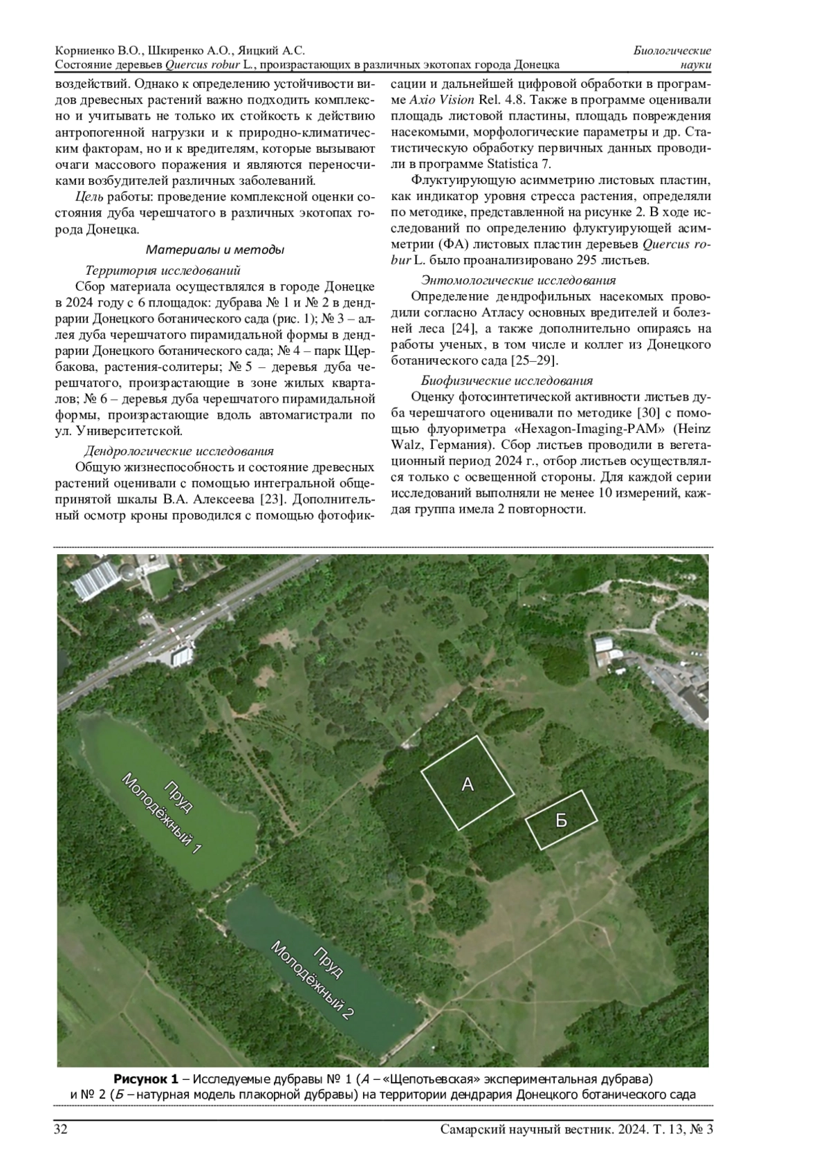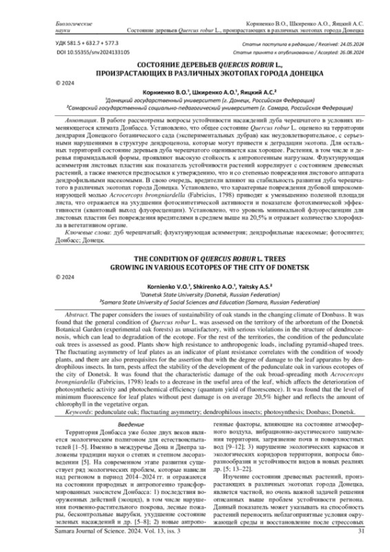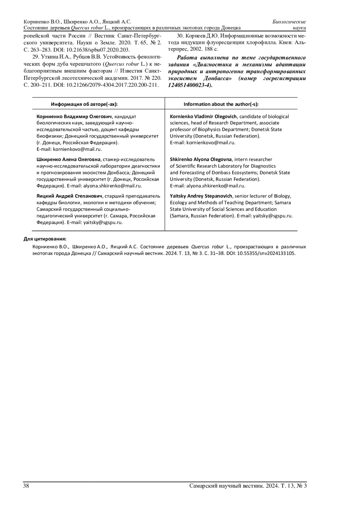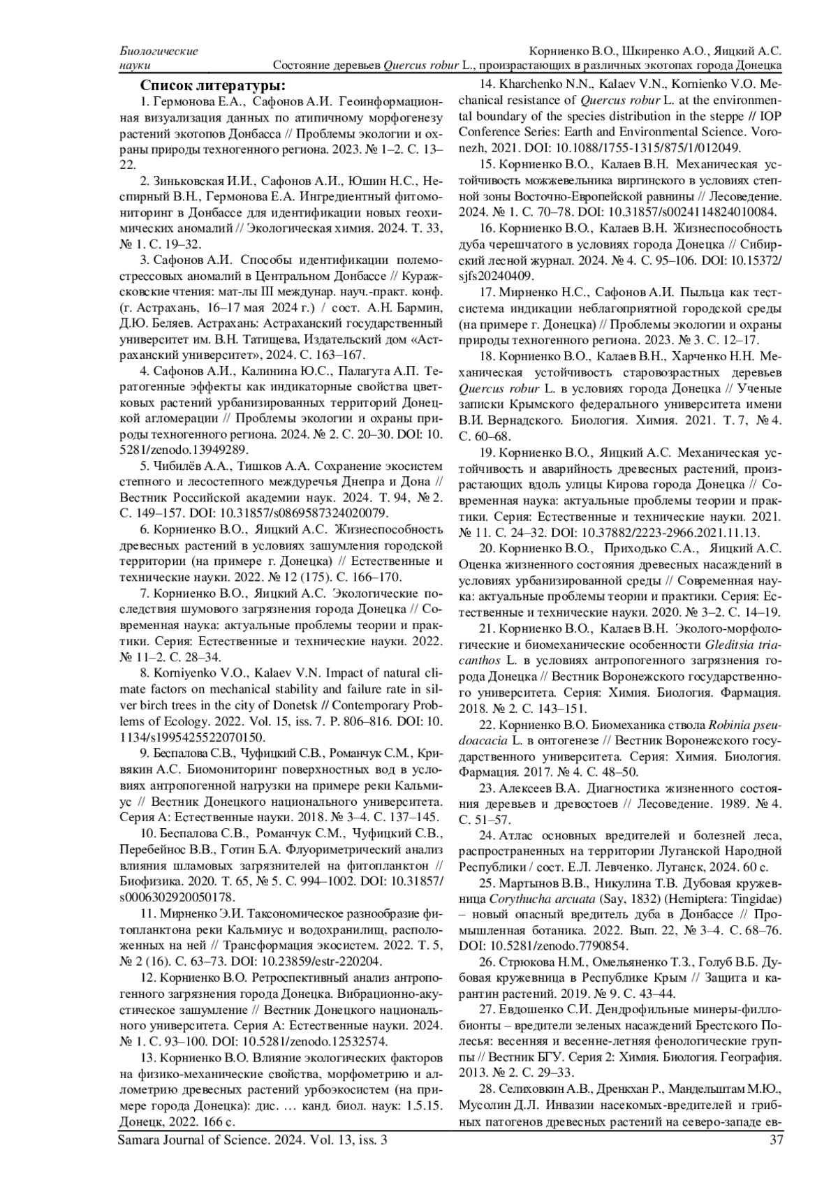 16. 	Корниенко В.О., Калаев В.Н. Жизнеспособность дуба черешчатого в условиях города Донецка // Сибирский лесной журнал. 2024. № 4. С. 95-106. DOI: 10.15372/sjfs20240409 EDN: SPLUNB