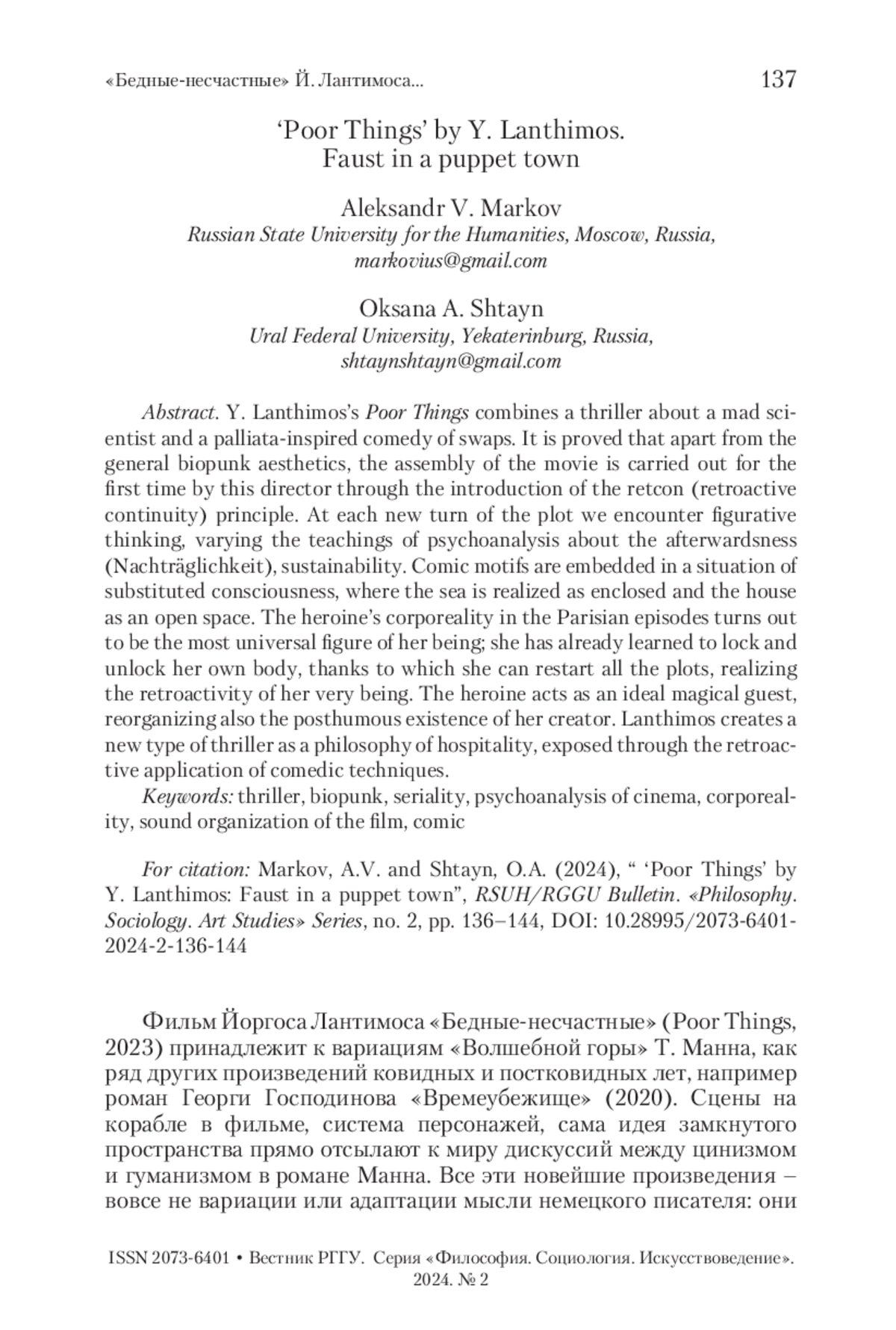 Фильм Й. Лантимоса «Бедные-несчастные» соединяет в себе триллер о безумном ученом и комедию подмен в духе паллиаты. Доказывается, что помимо общей эстетики биопанка, сборка фильма впервые у этого режиссера осуществляется благодаря внедрению принципа реткона (retroactivecontinuity). На каждом новом повороте сюжета мы встречаем фигуральное мышление, варьирующее учение психоанализа об отложенном эффекте (Nachträglichkeit) травмы. Комические мотивы встроены в ситуацию подмененного сознания, когда море осознается как замкнутое, а дом – как разомкнутое пространство. Телесность героини в парижских эпизодах и оказывается наиболее универсальной фигурой ее бытия, она уже научилась замыкать и размыкать собственное тело, благодаря чему и может перезапустить все сюжеты, осуществив ретроактивность самого своего бытия. Героиня выступает как идеальный магический гость, реорганизующий в том числе посмертное существование своего создателя. Лантимос создает новый тип триллера как философии гостеприимства, раскрываемой через ретроактивное использование комедийных приемов.