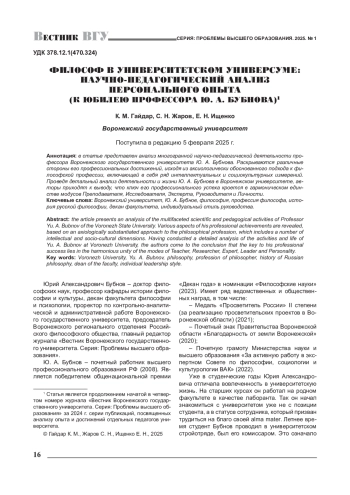 В статье представлен анализ многогранной научно-педагогической деятельности профессора Воронежского государственного университета Ю. А. Бубнова. Раскрываются различные стороны его профессиональных достижений, исходя из аксиологически обоснованного подхода к философской профессии, включающей в себя ряд интеллектуальных и социокультурных измерений. Проведя детальный анализ деятельности и жизни Ю. А. Бубнова в Воронежском университете, авторы приходят к выводу, что ключ его профессионального успеха кроется в гармоническом единстве модусов Преподавателя, Исследователя, Эксперта, Руководителя и Личности.
