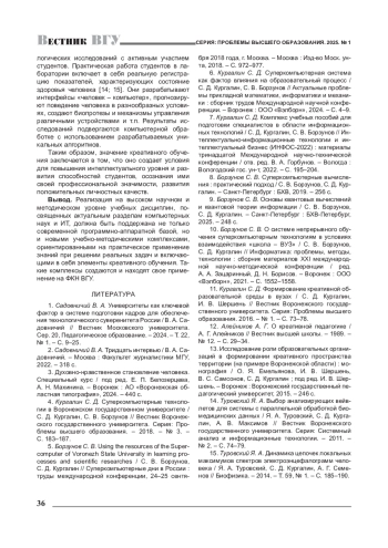 11. Кургалин С. Д. Формирование креативной образовательной среды в вузах / С. Д. Кургалин, И. В. Шершень // Вестник Воронежского государственного университета. Серия: Проблемы высшего образования. 2016. - № 1. - С. 73-78. EDN: VVYRPV