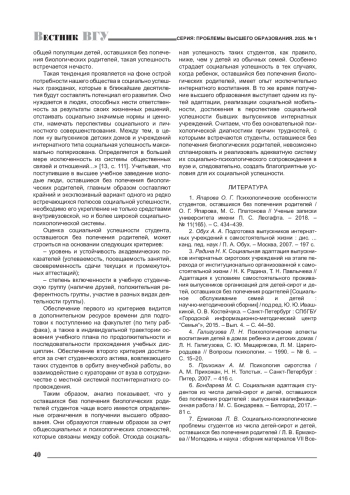 1. 	Япарова О. Г Психологические особенности студентов, оставшихся без попечения родителей / О. Г. Япарова, М. С. Платонова // Ученые записки университета имени П. С. Лесгафта. - 2018. -№11(165).-С. 434-439. EDN: YPSFBZ УДК: 159.9