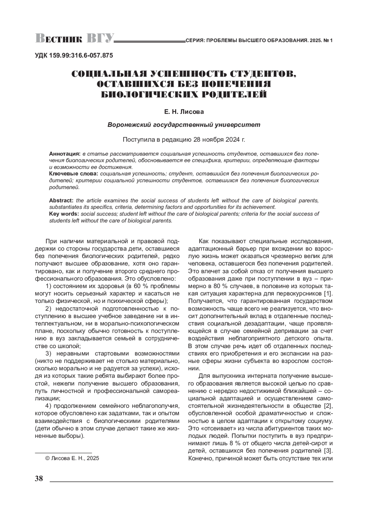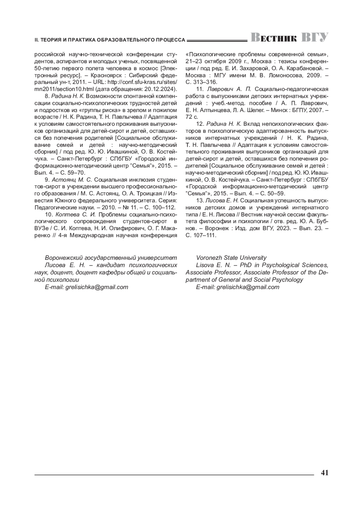 13. 	Лисова Е. Н. Социальная успешность выпускников детских домов и учреждений интернатного типа / Е. Н. Лисова // Вестник научной сессии факультета философии и психологии / отв. ред. Ю. А. Бубнов. - Воронеж: Изд. дом ВГУ, 2023. - Вып. 23. - С. 107-111. EDN: EGQYYQ