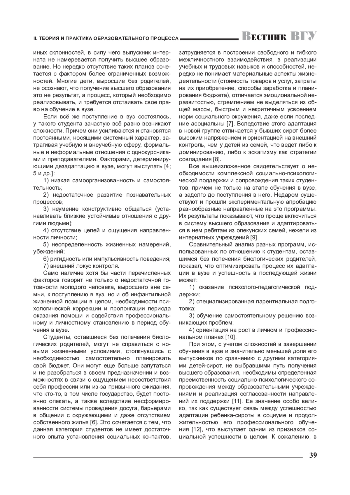 Обеспечение первого из критериев видится в дополнительном ресурсе времени для подготовки к поступлению на факультет (по типу рабфака), а также в индивидуальной траектории освоения учебного плана по продолжительности и последовательности прохождения учебных дисциплин. Обеспечение второго критерия достигается за счет студенческого актива, вовлекающего таких студентов в орбиту внеучебной работы, во взаимодействие с кураторами от вуза в сотрудничестве с местной системой постинтернатного сопровождения.