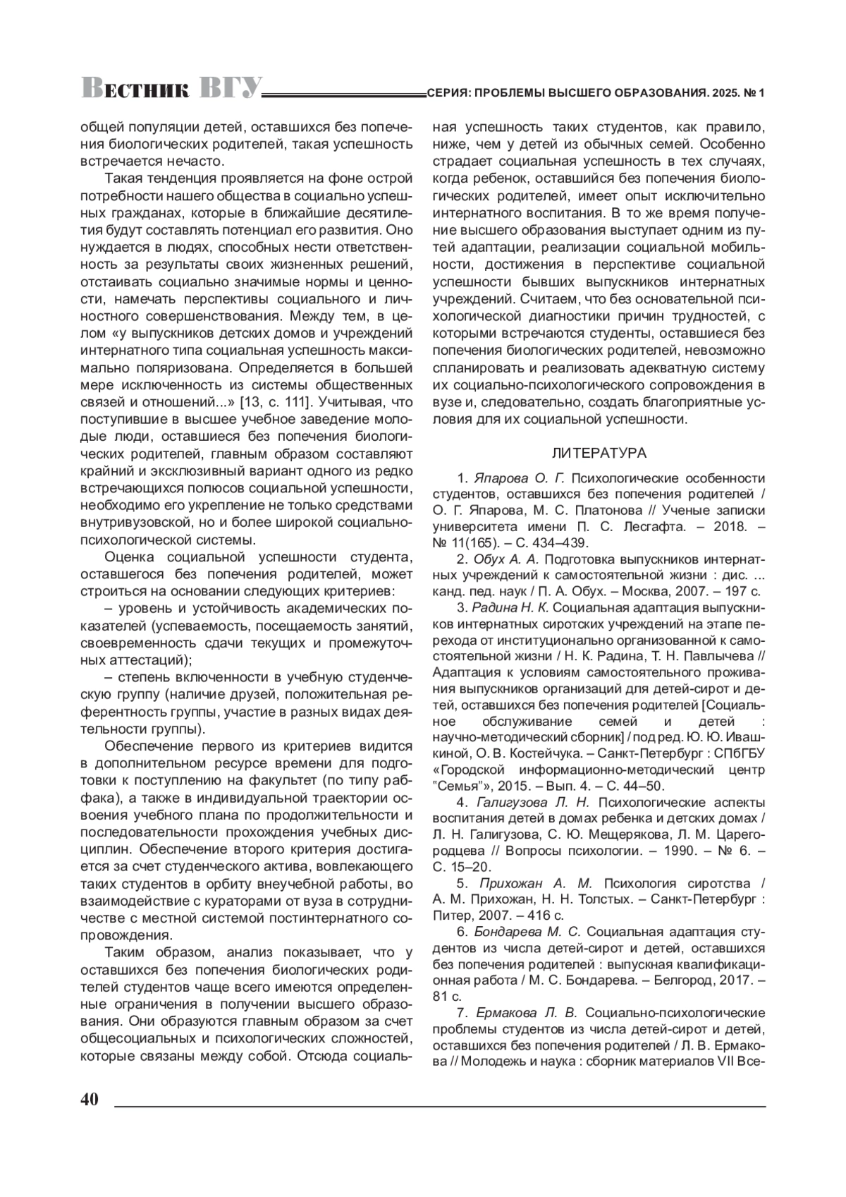 7. 	Ермакова Л. В. Социально-психологические проблемы студентов из числа детей-сирот и детей, оставшихся без попечения родителей / Л. В. Ермакова // Молодежь и наука: сборник материалов VII Всероссийской научно-технической конференции студентов, аспирантов и молодых ученых, посвященной 50-летию первого полета человека в космос [Электронный ресурс]. - Красноярск: Сибирский федеральный ун-т, 2011. - URL: http://conf.sfu-kras.ru/sites/ mn2011/section10.html (дата обращения: 20.12.2024).