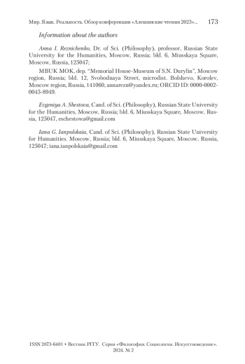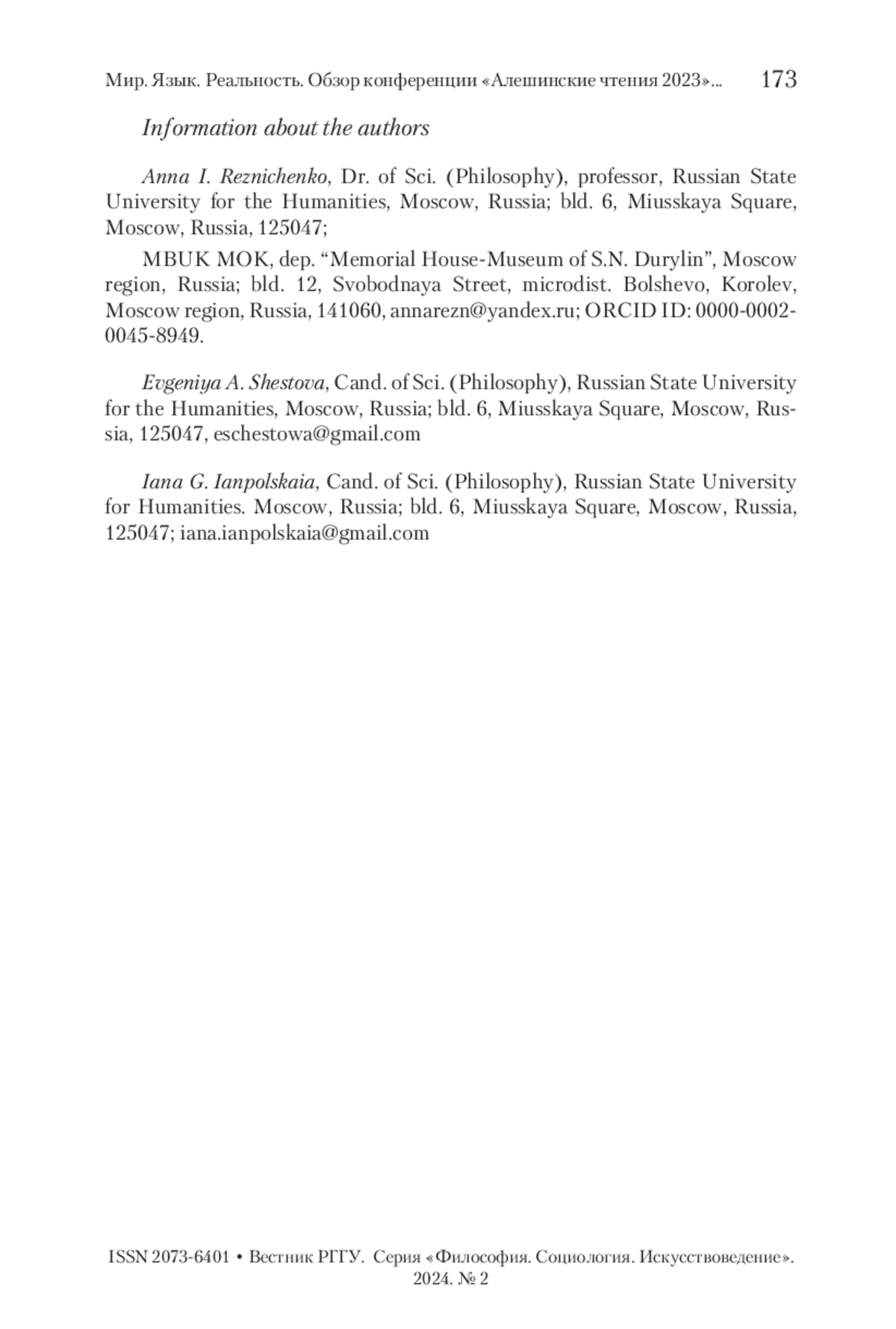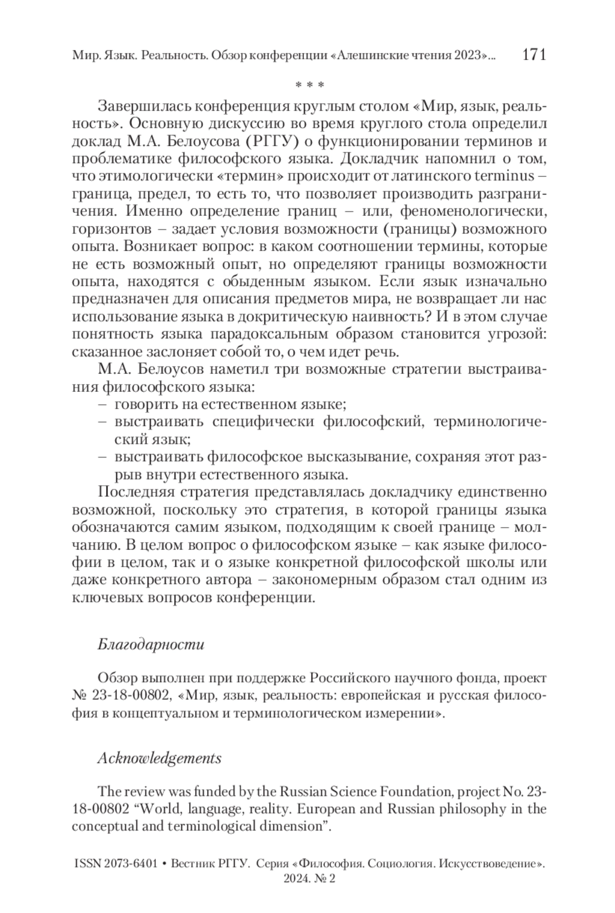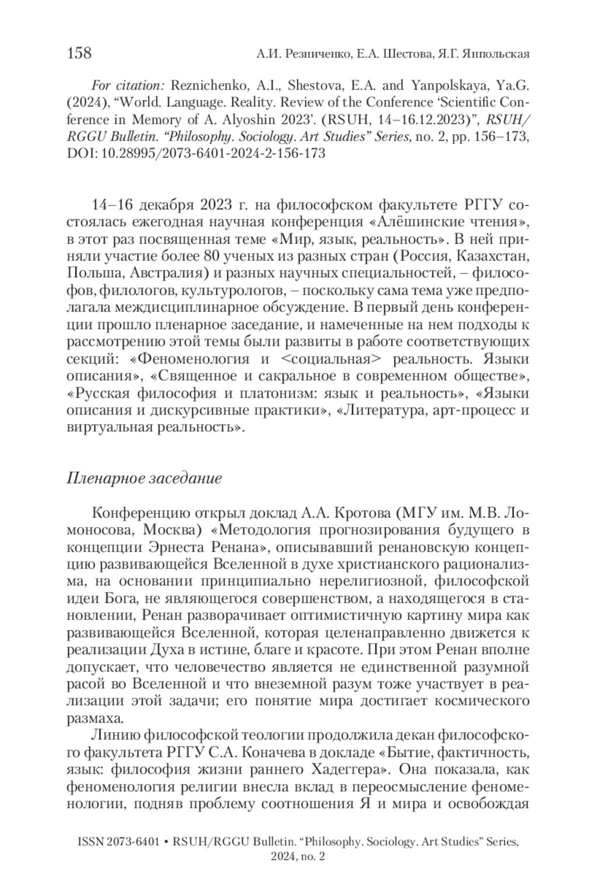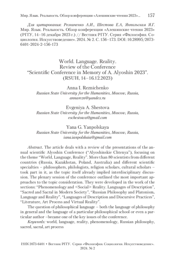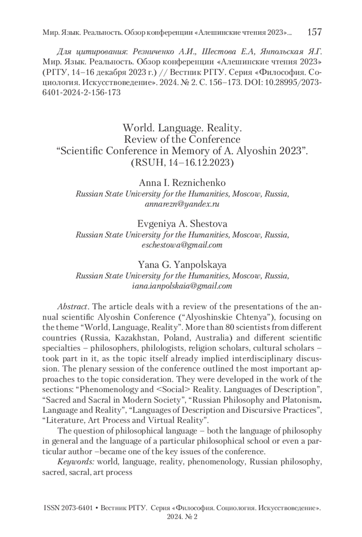 Статья посвящена обзору докладов ежегодной научной конференции «Алёшинские чтения», в этот раз посвященной теме «Мир, язык, реальность». В ней приняли участие более 80 ученых из разных стран (Россия, Казахстан, Польша, Австралия) и разных научных специальностей, – философов, филологов, религиоведов, культурологов, – поскольку сама тема уже предполагала междисциплинарное обсуждение. На пленарном заседании конференции были намечены важнейшие подходы к рассмотрению этой темы. Они были развиты в работе секций: «Феноменология и <социальная> реальность. Языки описания», «Священное и сакральное в современном обществе», «Русская философия и платонизм: язык и реальность», «Языки описания и дискурсивные практики», «Литература, арт-процесс и виртуальная реальность».