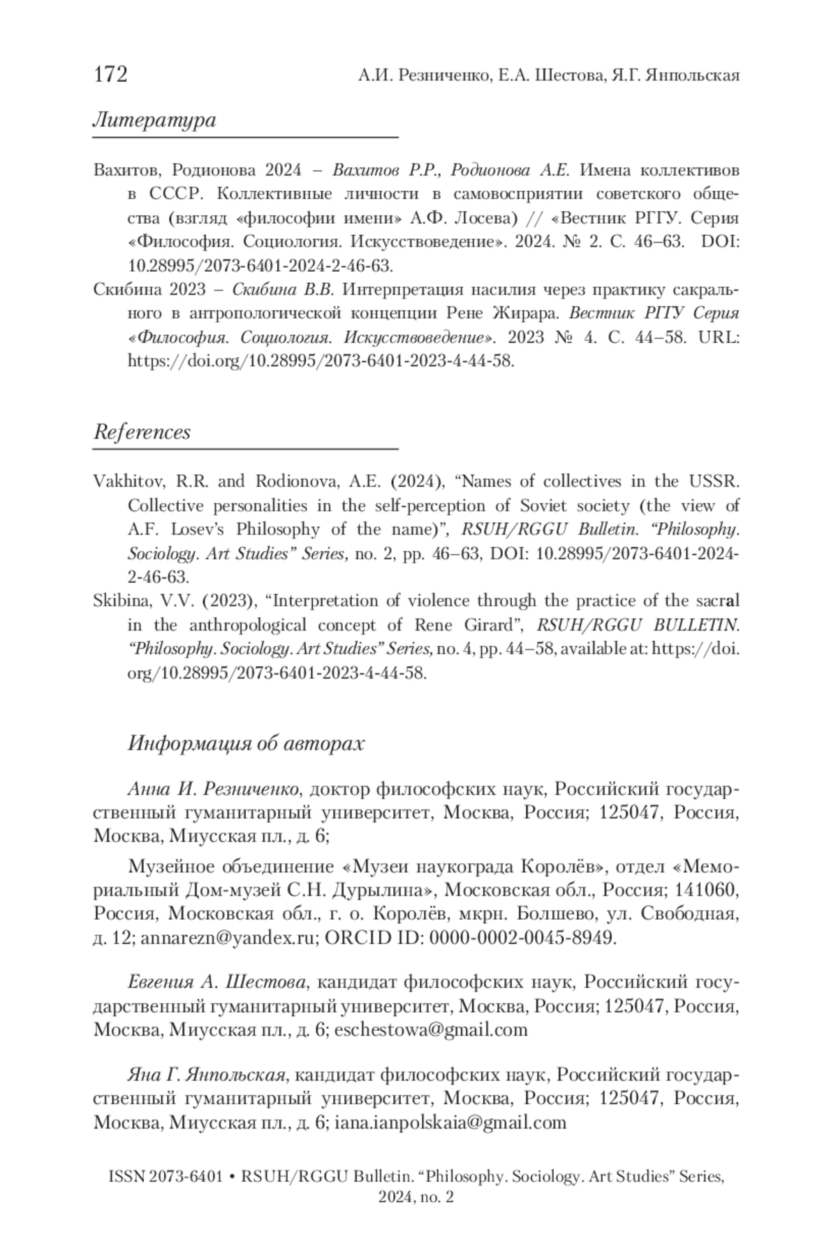 1. Вахитов, Родионова 2024 - Вахитов Р.Р., Родионова А.Е. Имена коллективов в СССР. Коллективные личности в самовосприятии советского общества (взгляд «философии имени» А.Ф. Лосева) // «Вестник РГГУ. Серия «Философия. Социология. Искусствоведение». 2024. № 2. С. 46-63. https://doi.org/10.28995/2073-6401-2024-2-46-63.