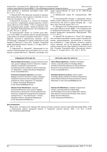 11. Карпухина Е.А., Орлова В.С., Никольский А.А. Копытные млекопитающие как селективная сила по отношению к суркам (Marmota) // Прошлое, настоящее и будущее сурков Евразии: сб. науч. тр. М.: АБФ Медиа, 2015. С. 52-62.
