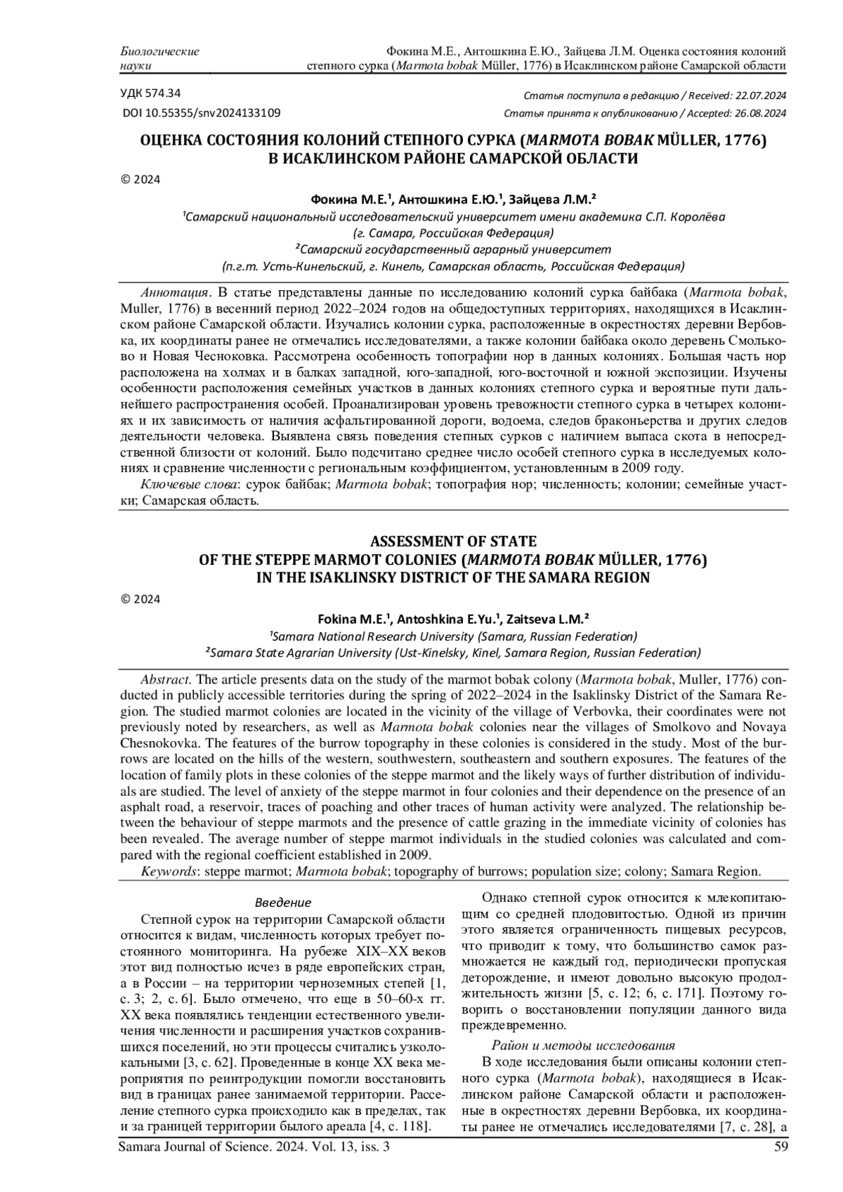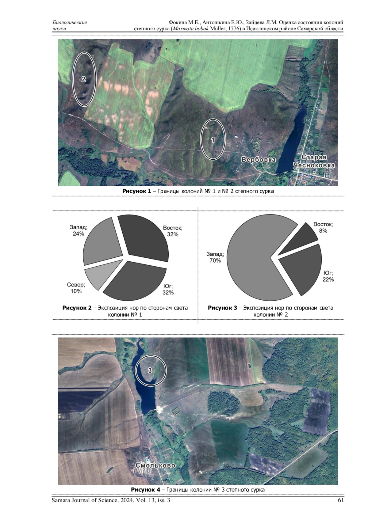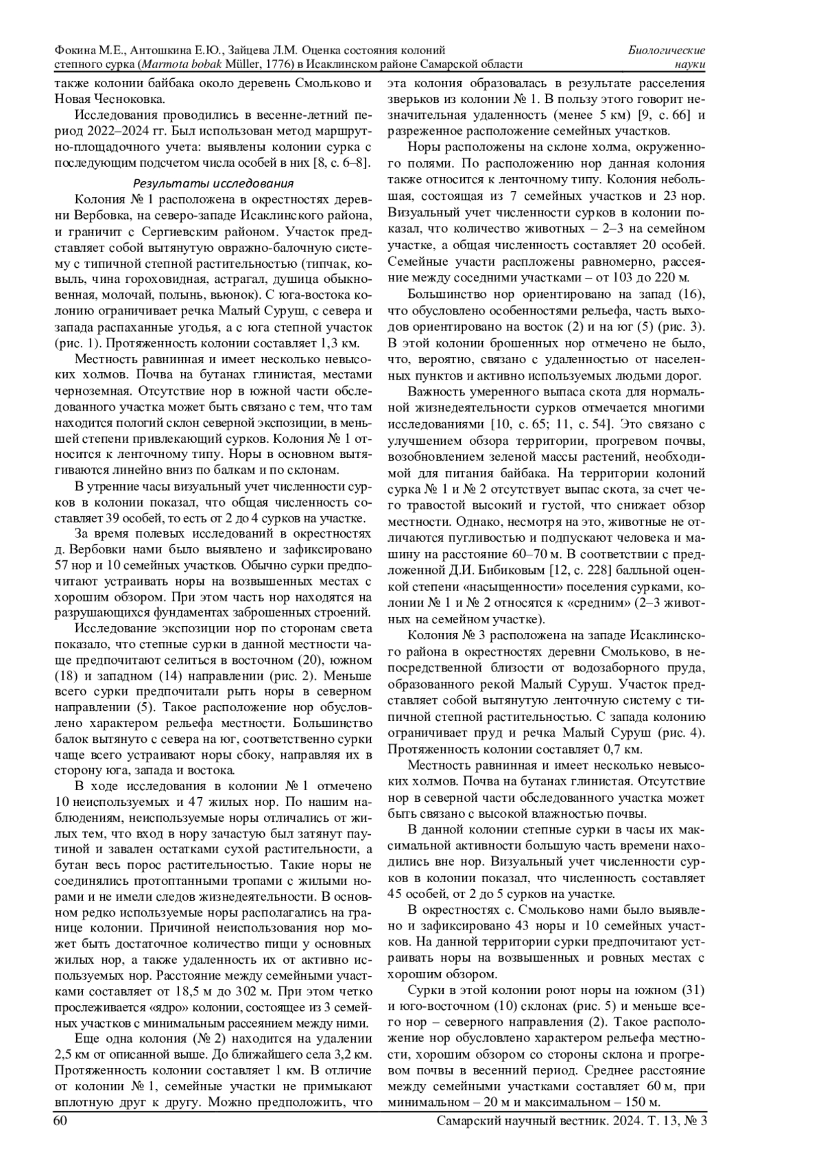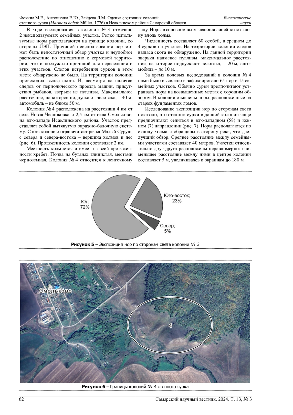 В статье представлены данные по исследованию колоний сурка байбака ( Marmota bobak, Muller, 1776) в весенний период 2022-2024 годов на общедоступных территориях, находящихся в Исаклинском районе Самарской области. Изучались колонии сурка, расположенные в окрестностях деревни Вербовка, их координаты ранее не отмечались исследователями, а также колонии байбака около деревень Смольково и Новая Чесноковка. Рассмотрена особенность топографии нор в данных колониях. Большая часть нор расположена на холмах и в балках западной, юго-западной, юго-восточной и южной экспозиции. Изучены особенности расположения семейных участков в данных колониях степного сурка и вероятные пути дальнейшего распространения особей. Проанализирован уровень тревожности степного сурка в четырех колониях и их зависимость от наличия асфальтированной дороги, водоема, следов браконьерства и других следов деятельности человека. Выявлена связь поведения степных сурков с наличием выпаса скота в непосредственной близости от колоний. Было подсчитано среднее число особей степного сурка в исследуемых колониях и сравнение численности с региональным коэффициентом, установленным в 2009 году.