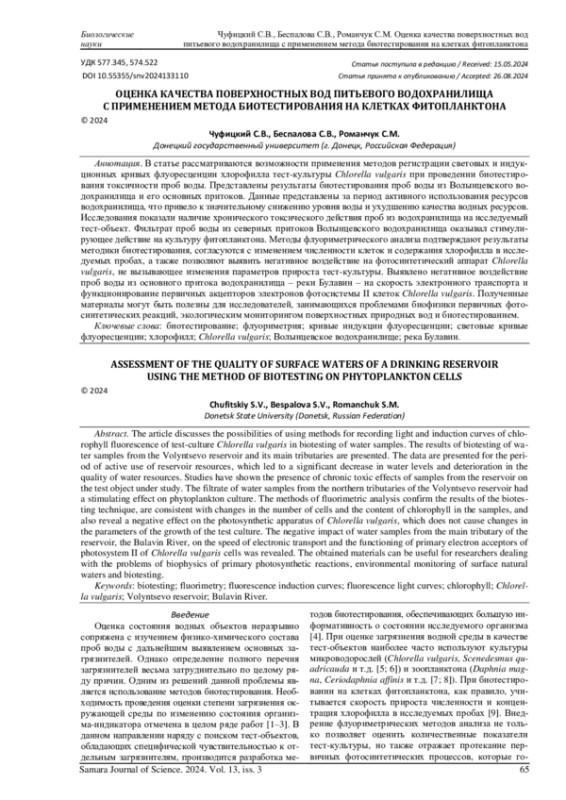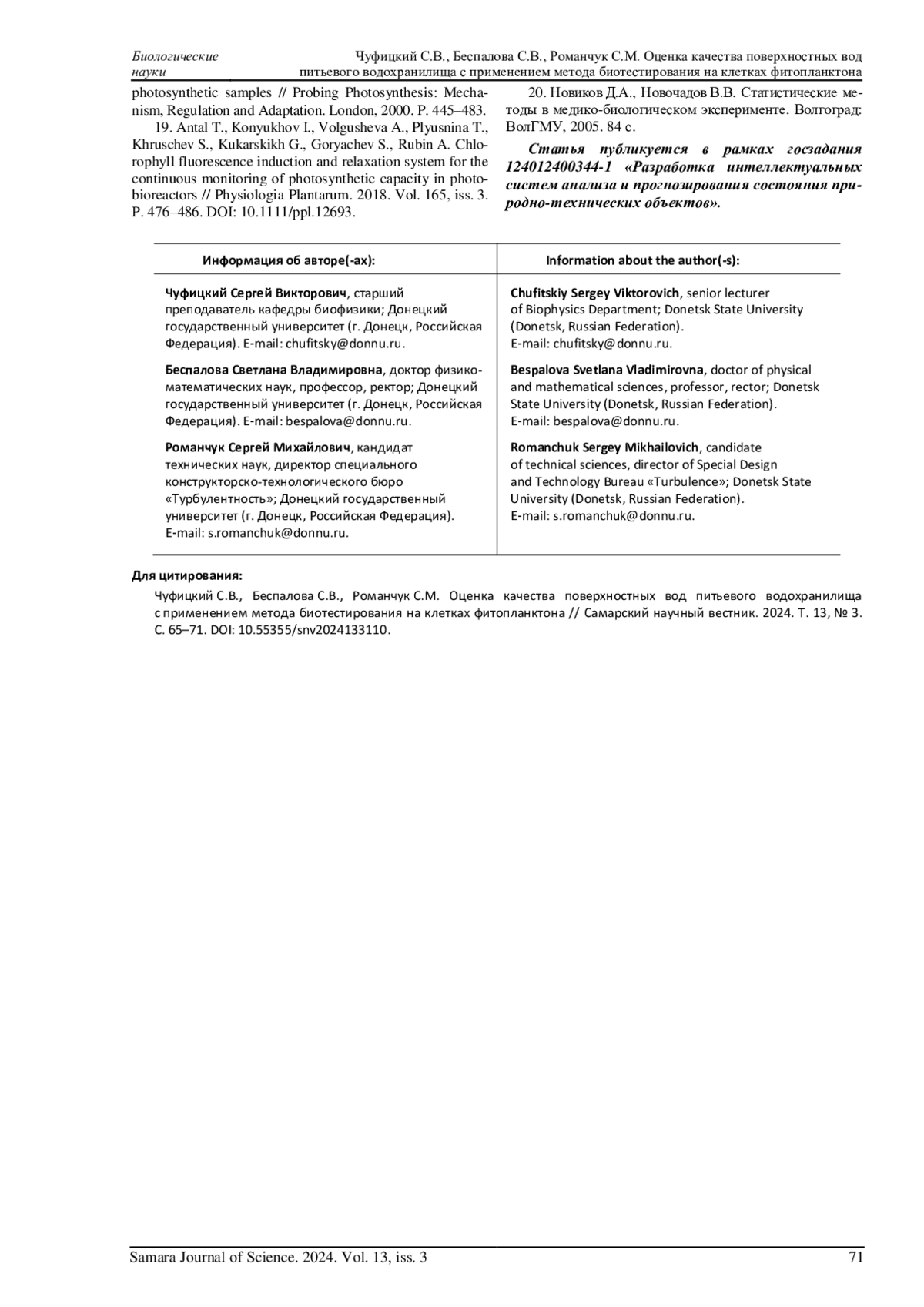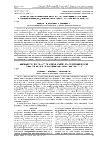 15. Bespalova S.V., Romanchuk S.M., Chufitskiy S.V., Perebeinos V.V., Gotin B.A. Fluorimetric analysis of the impact of coal sludge pollution on phytoplankton // Biophysics. 2020. Vol. 65, № 5. P. 850-857. DOI: 10.1134/s0006350920050024 EDN: KQNZPP
